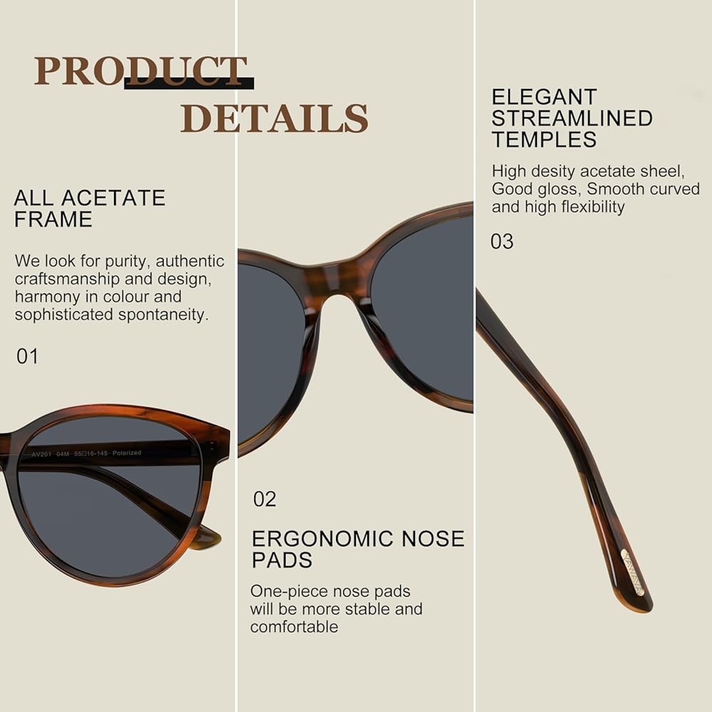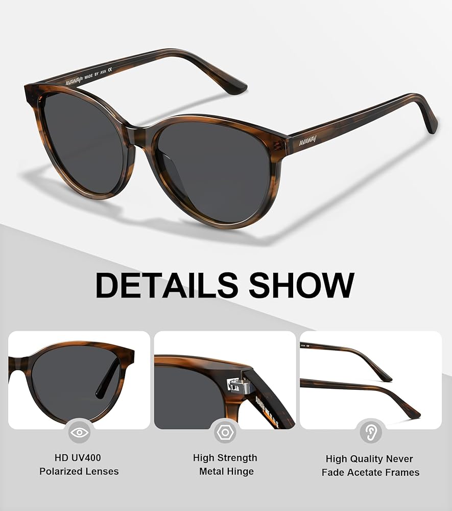 • 【إطار دائري كلاسيكي للجميع】نظارات شمسية مستديرة عصرية من AVAWAY 2023 تجلب أنماطًا جديدة. إطار من الأسيتات بلون السلحفاة البني مع عدسات بنية متدرجة، والتي تصبح أخف عندما تنظر إلى أسفل العدسة. تعمل العدسات ذات اللون البني المتدرج على تضخيم التباين وتحسين إدراك العمق. كما أنه يضيف الدفء للحصول على رؤية أكثر نعومة وراحة. تعتبر نظارات AVAWAY المستقطبة من الفئة 3 مناسبة لكل من النساء والرجال وتناسب معظم أشكال الوجه، لذلك يمكن للجميع تقريبًا الاستمتاع بهذا الإكسسوار الأنيق السهل.