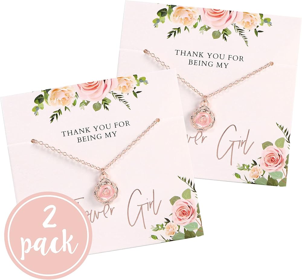 تأتي قلادة الفتيات الزهرية الثمينة الخاصة بنا في عبوة من قطعتين وعلى بطاقة فاخرة مع طباعة رقائق ذهبية وردية. متوفر في 2 أنماط. تقرأ البطاقات إما "شكرًا لكونك فتاة الزهرة" أو "هل ستكونين فتاة الزهرة؟" أبهر وأسعد فتاة الزهرة الخاصة بك بهدية ستعتز بها لسنوات قادمة!