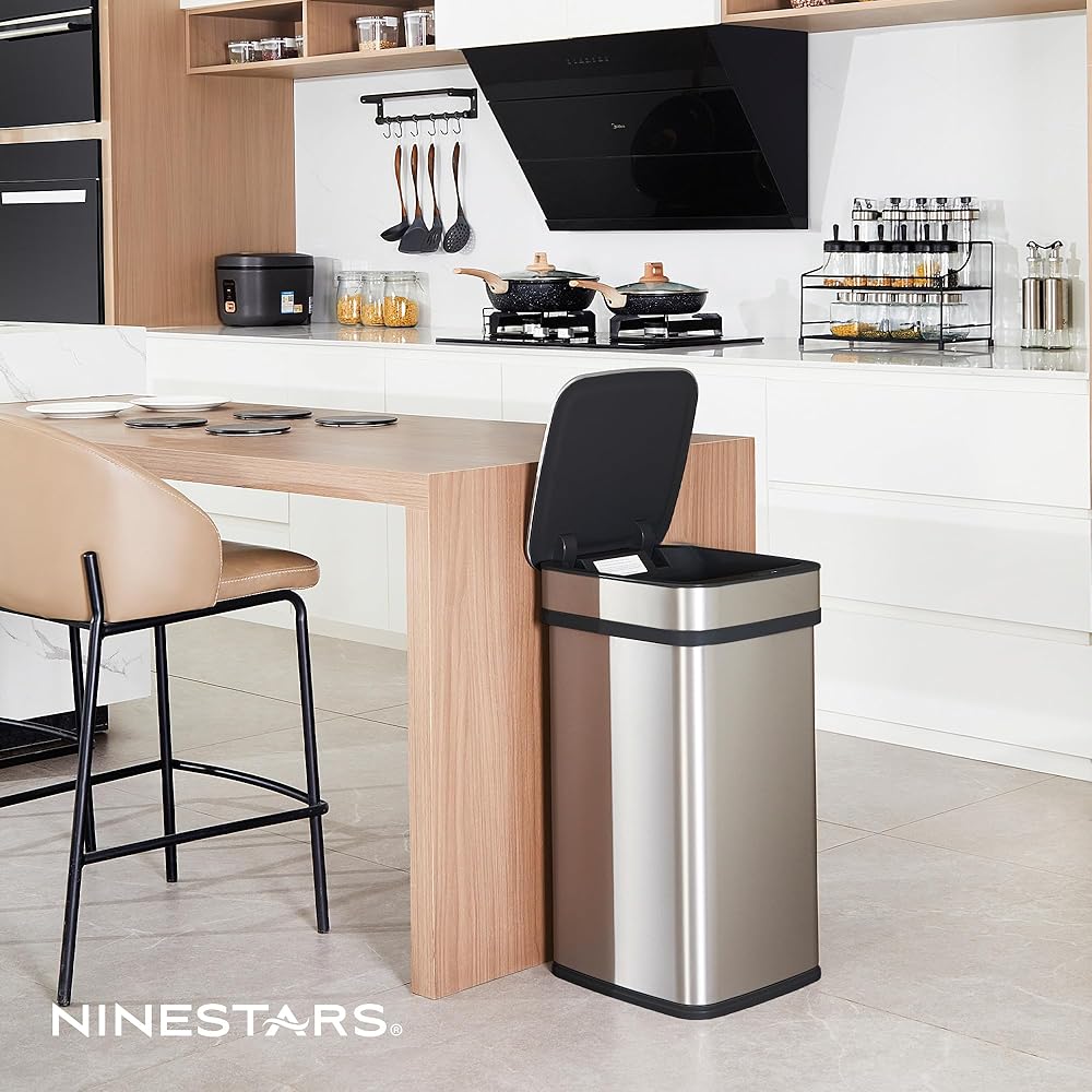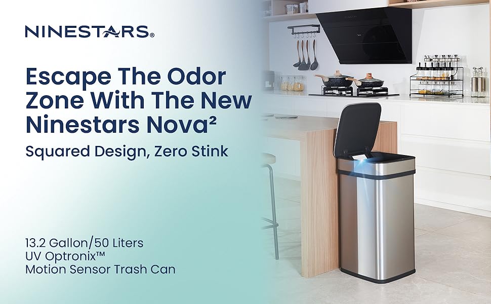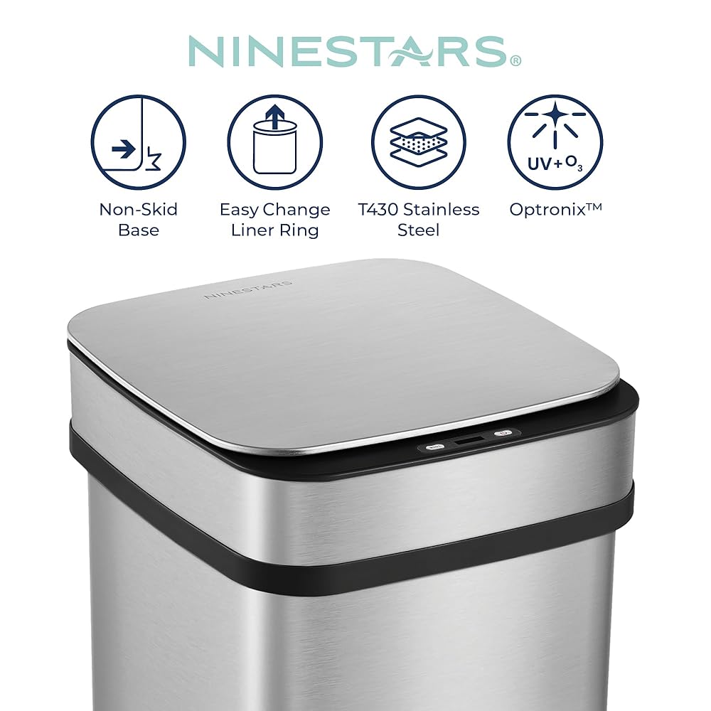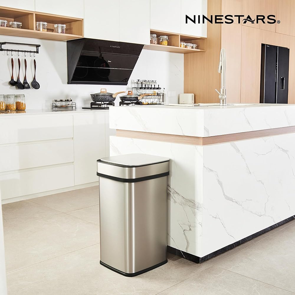 سلة مهملات المطبخ الذكية سعة 13 جالون من Ninestars، سلة قمامة مستشعر الحركة للتحكم التلقائي في الرائحة، محول طاقة عالمي، 50 لتر من الفولاذ المقاوم للصدأ ذو الفتح الذكي، سلسلة نوفا