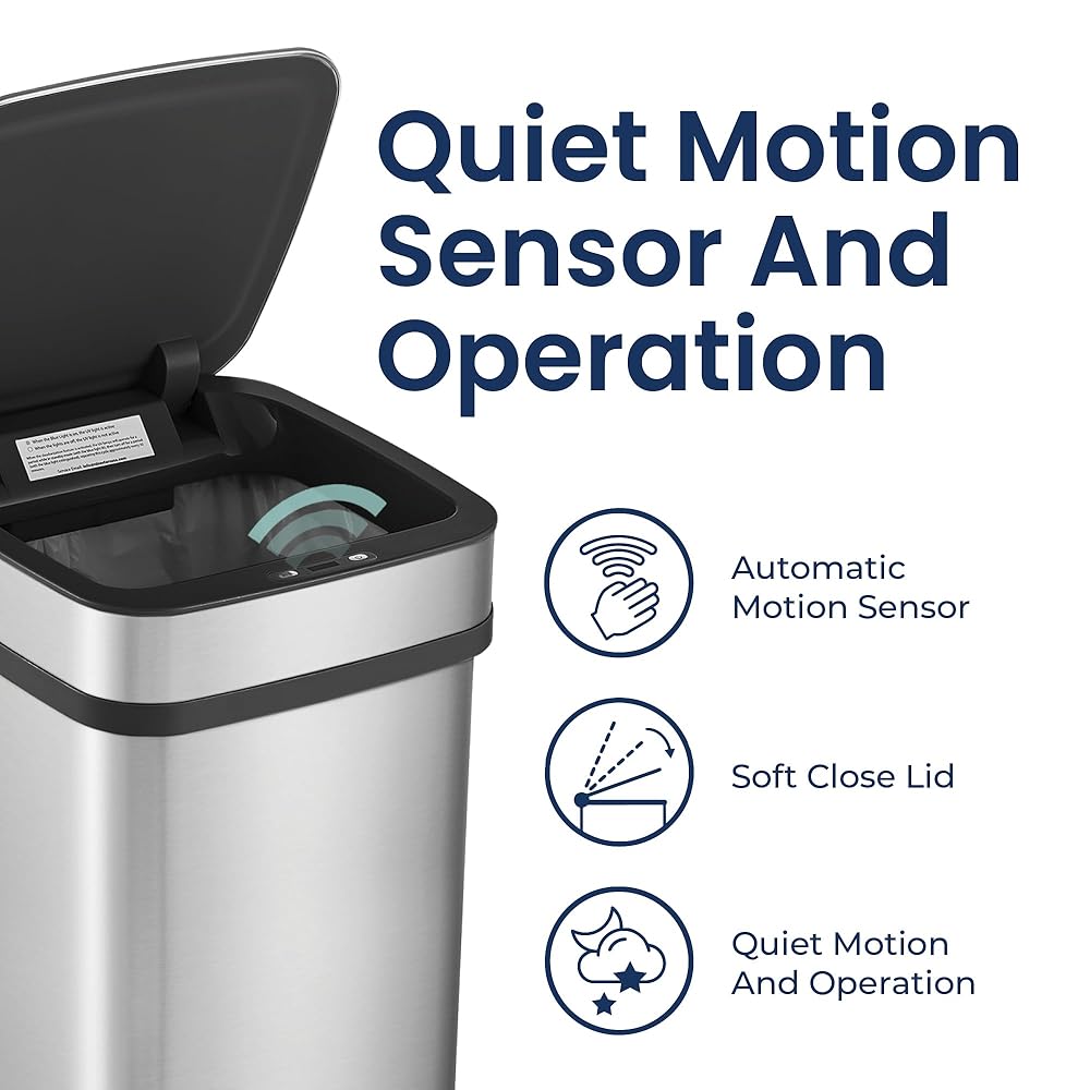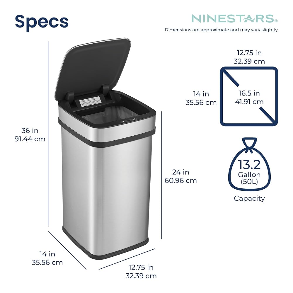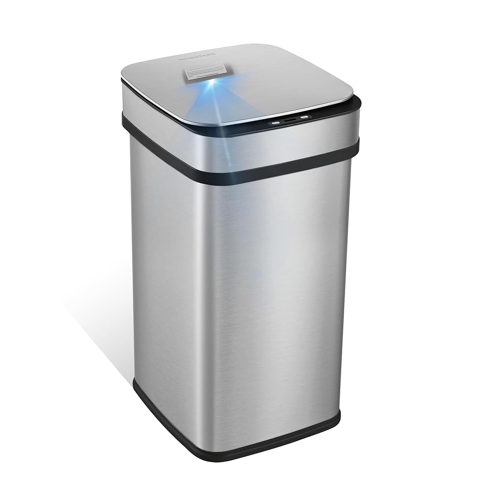 سلة مهملات المطبخ الذكية سعة 13 جالون من Ninestars، سلة قمامة مستشعر الحركة للتحكم التلقائي في الرائحة، محول طاقة عالمي، 50 لتر من الفولاذ المقاوم للصدأ ذو الفتح الذكي، سلسلة نوفا
