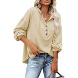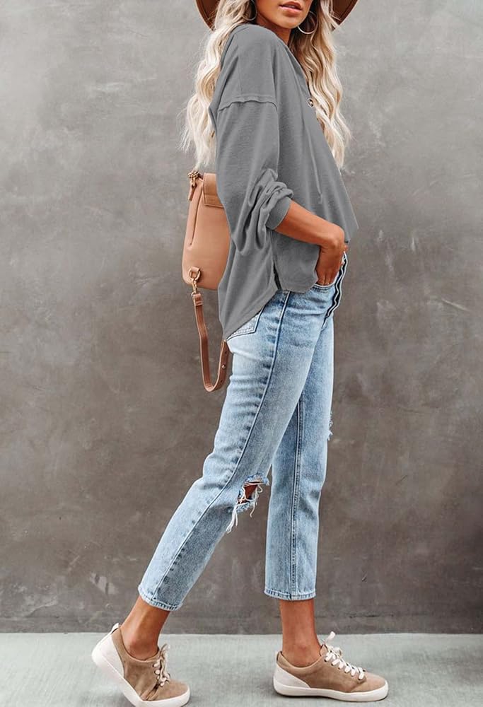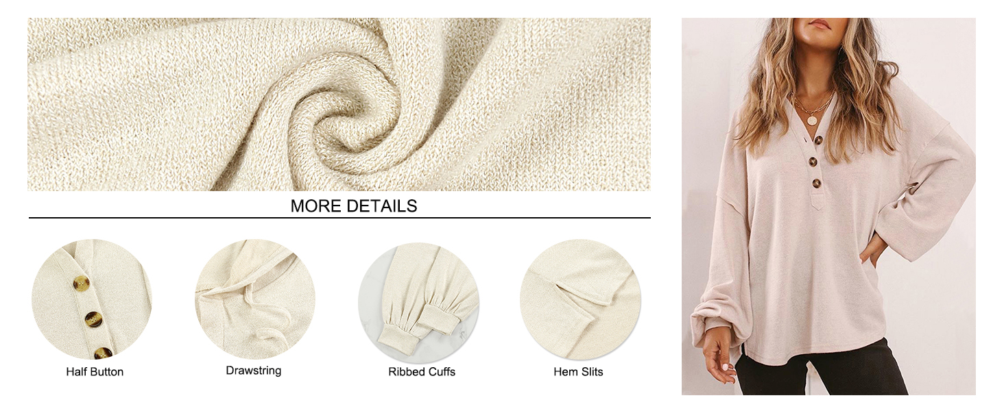 • قمصان هينلي بأزرار سفلية للسيدات بأصفاد مضلعة، وأكمام طويلة، ورقبة على شكل حرف V، ولون عادي، وقمصان صوفية فضفاضة.