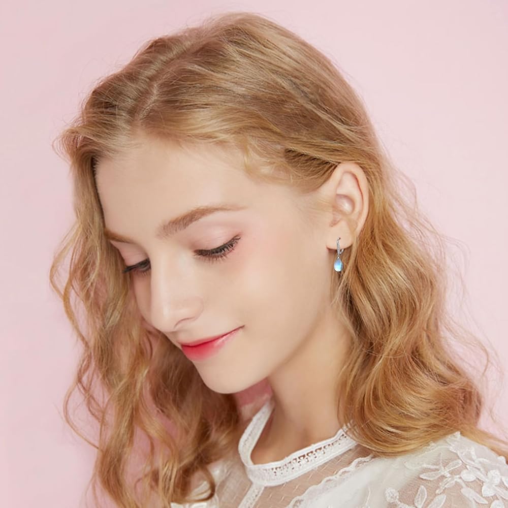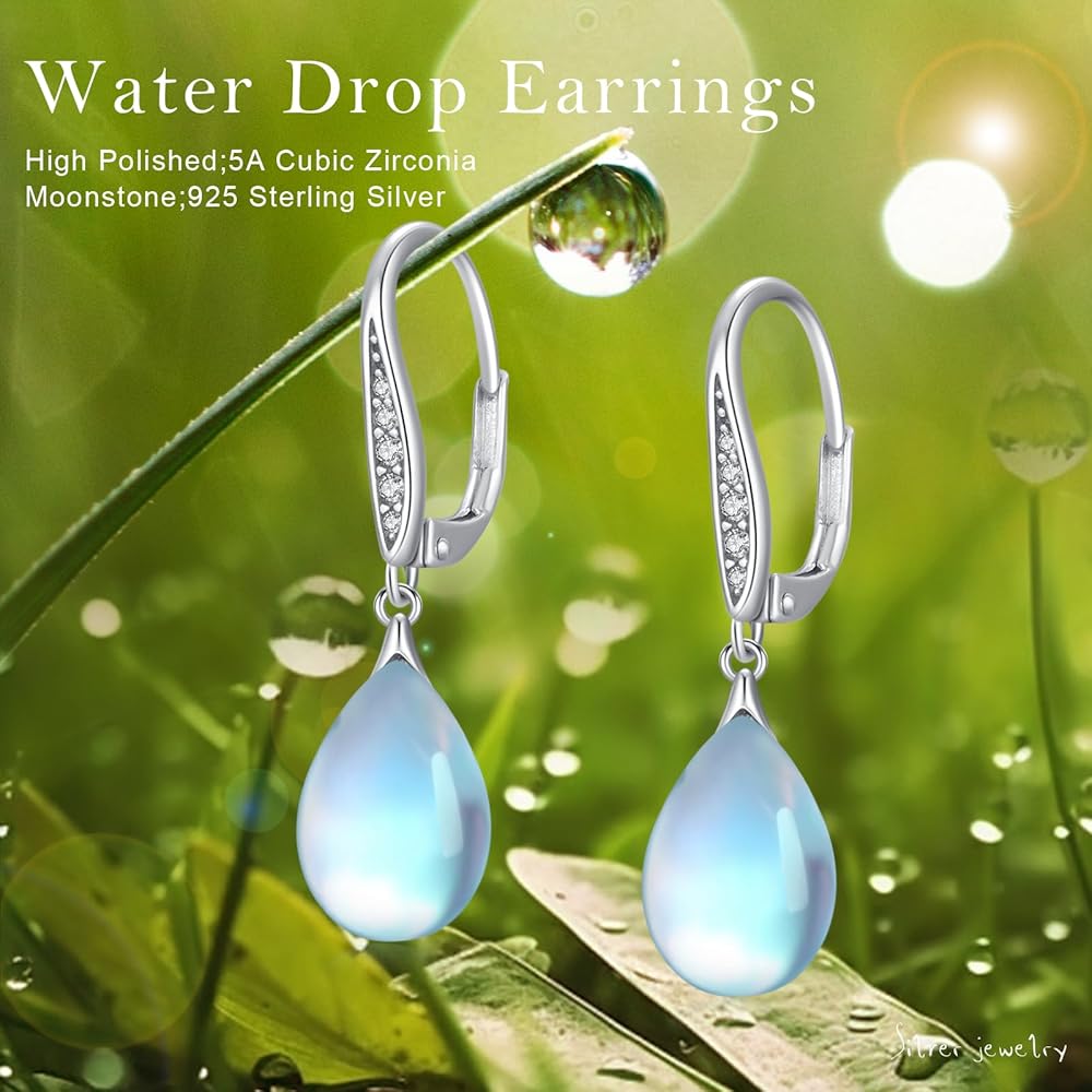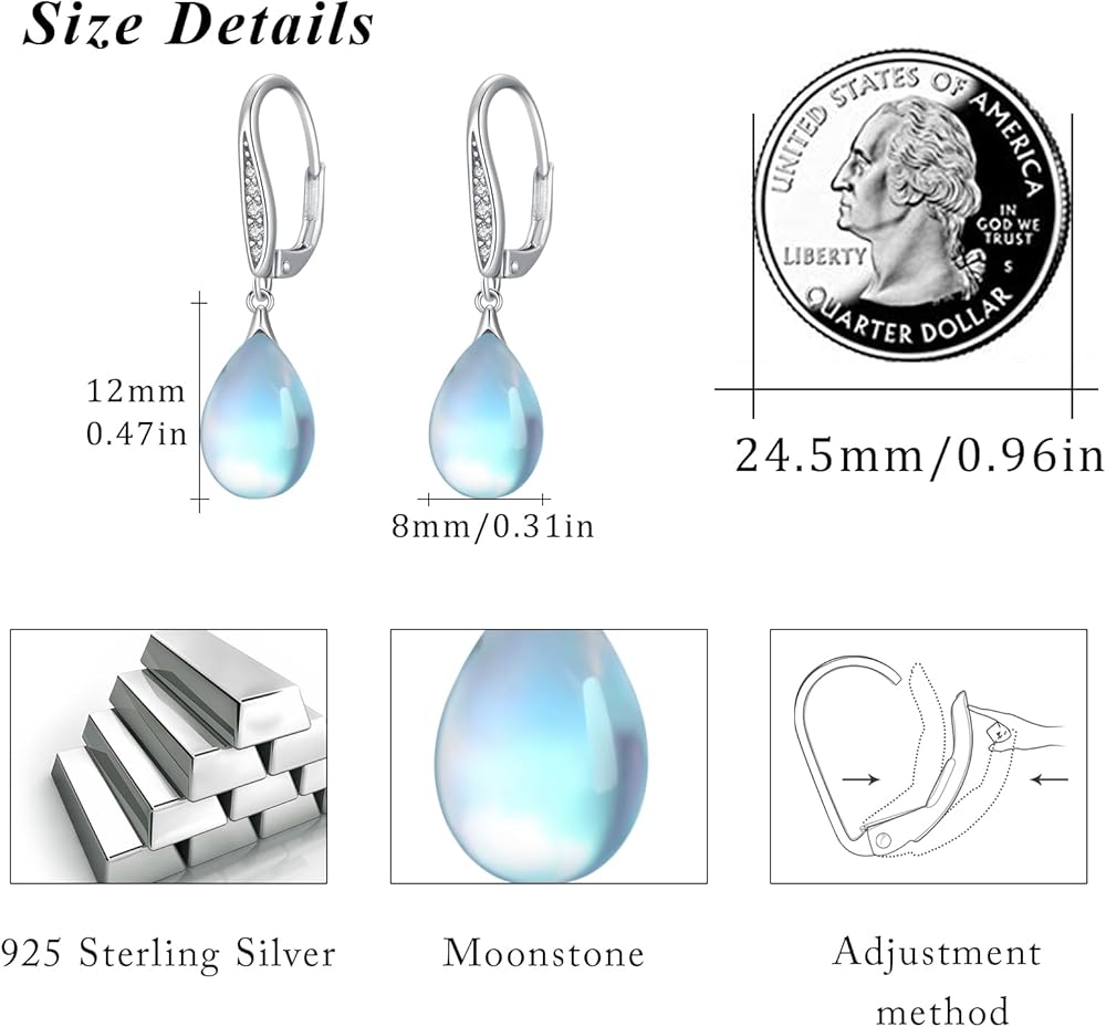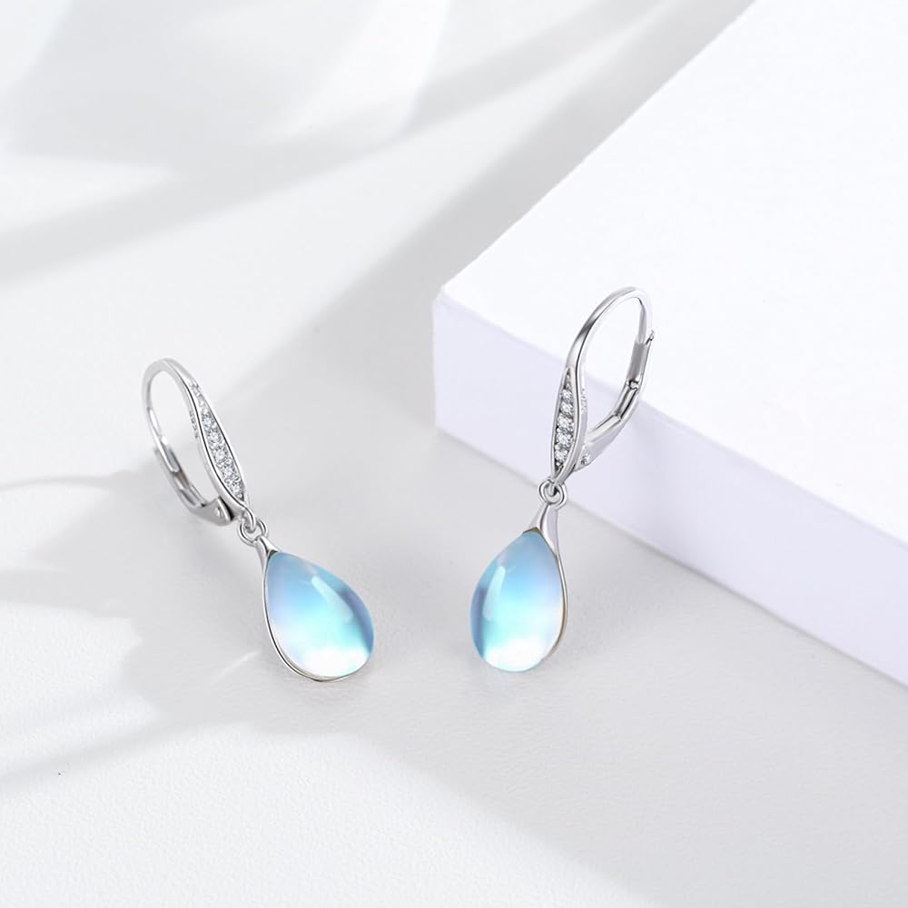 أقراط Moonstone Leverback العصرية من الفضة الإسترليني أقراط متدلية على شكل دمعة للنساء والفتيات والابنة والأم والأحجار الكريمة مجوهرات هدايا عيد الميلاد