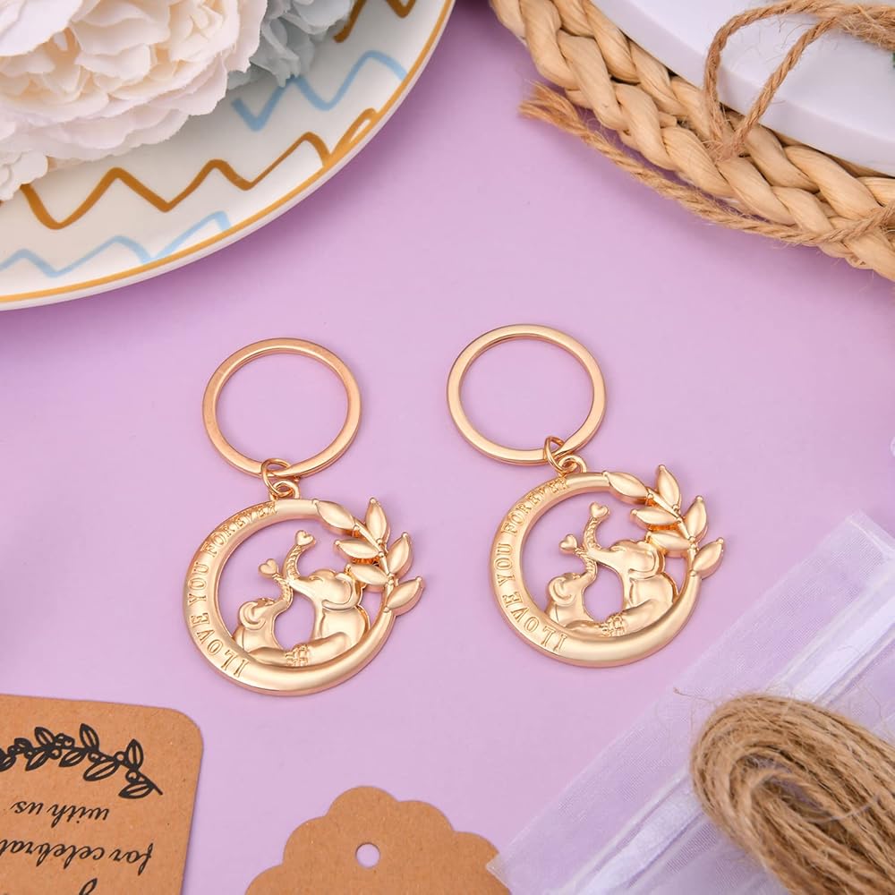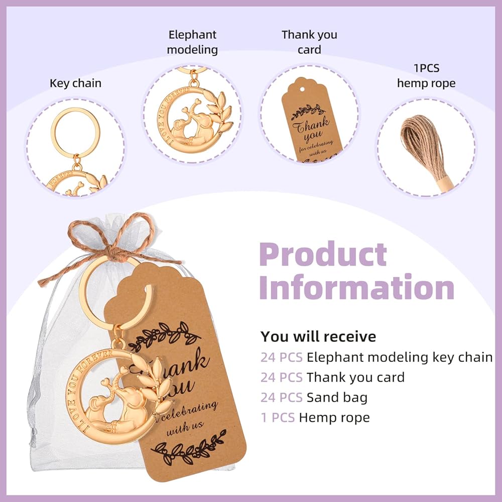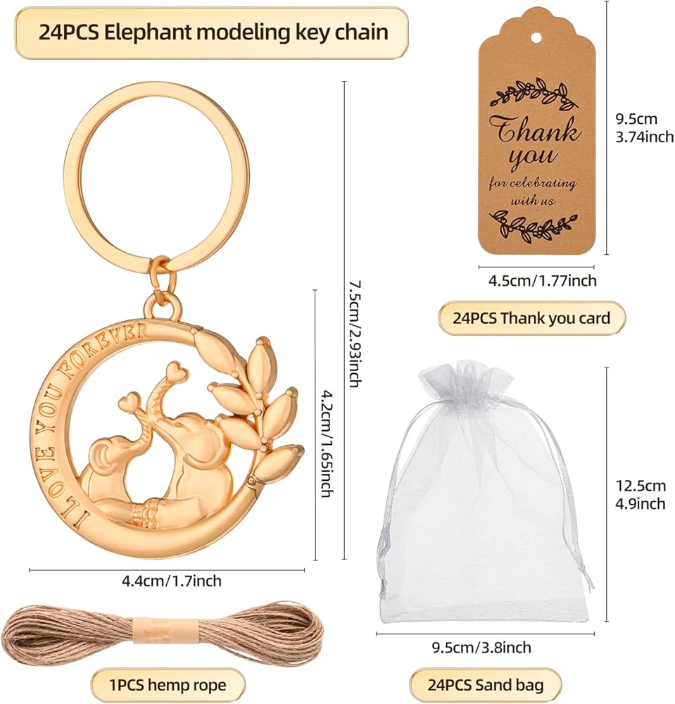 24 قطعة (I LOVE YOU FOREVER) سلسلة مفاتيح بتصميم فيل وحلقة مفاتيح مفضلة لحفلات استقبال المولود وحفلات الزفاف وهدايا الحفلات والهدايا التذكارية والديكورات، مع ملصقات وحقائب حريرية