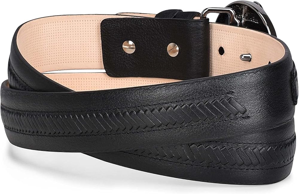مع تفاصيل منسوجة يدويًا على طول الحزام وفي الإبزيم