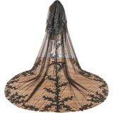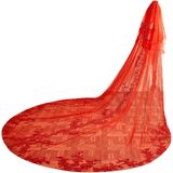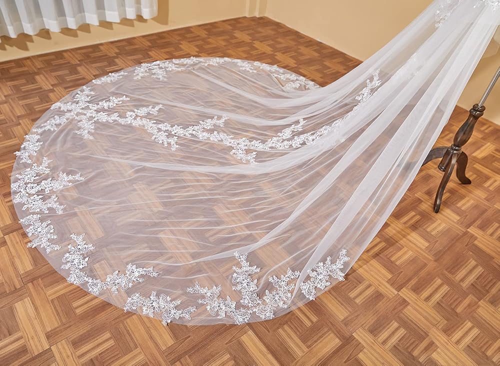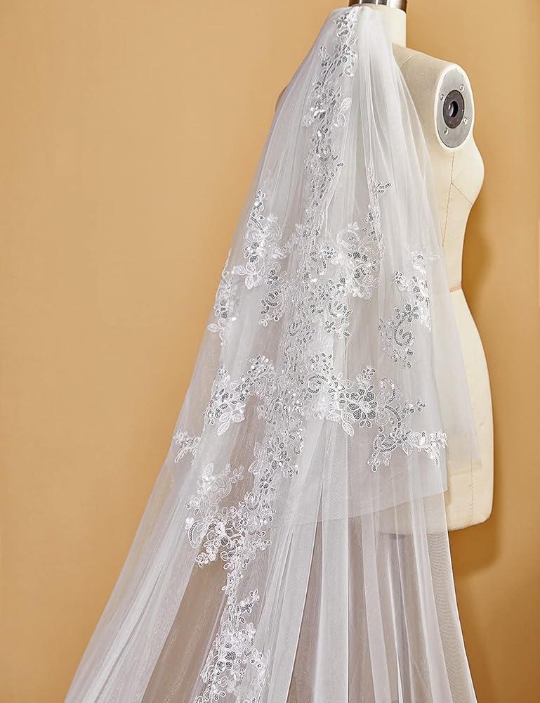 طرحة الزفاف تتميز بالدانتيل اللامع اللامع. يصل الدانتيل إلى منتصف الطريق إلى الجزء العلوي من طرحة الزفاف. الذيل كبير ومستدير الشكل
