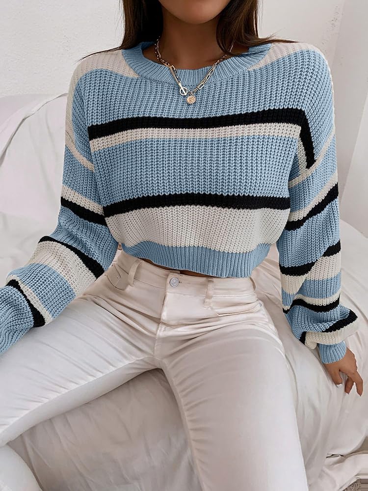 التصميمات: سترة مخططة، كتلة الألوان، سترة مقصوصة، نسيج مضلع، مقاس فضفاض، رقبة دائرية، هذه السترة الكاجوال المحبوكة أنيقة بقدر ما هي مريحة