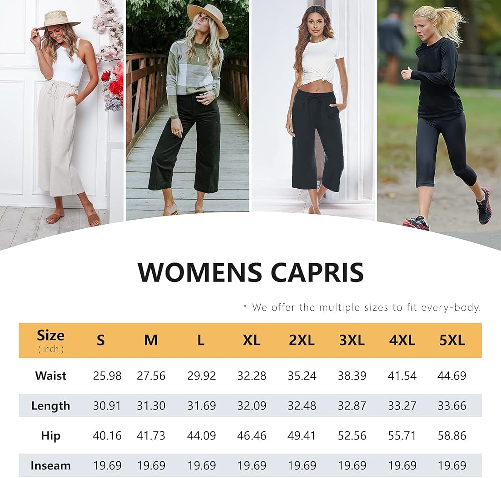 جدول مقاسات كابريس للسيدات من DIBAOLONG: S (الخصر-25.98، الطول-30.91)؛ M (الخصر 27.56، الطول 31.3)؛ L (الخصر 29.92، الطول 31.69)؛ XL (الخصر 32.28، الطول 32.09)؛ 2XL (الخصر 35.24، الطول 32.48)؛ 3XL (الخصر 38.39، الطول 32.87)؛ 4XL (الخصر-41.54، الطول-33.27)؛ 5XL (الخصر 44.69، الطول 33.66). طول الدرزة الداخلية المثالية: 19.69 بوصة. 【بنطال الكابري هذا ذو ساق واسعة وفضفاض، إذا كنت لا تحب فضفاضًا وواسعًا جدًا، فيرجى اختيار المقاس الأصغر.】