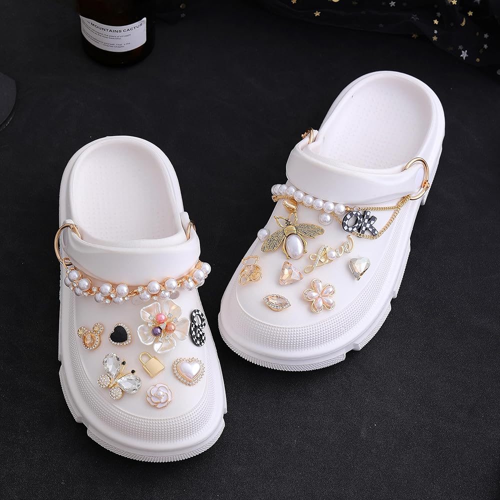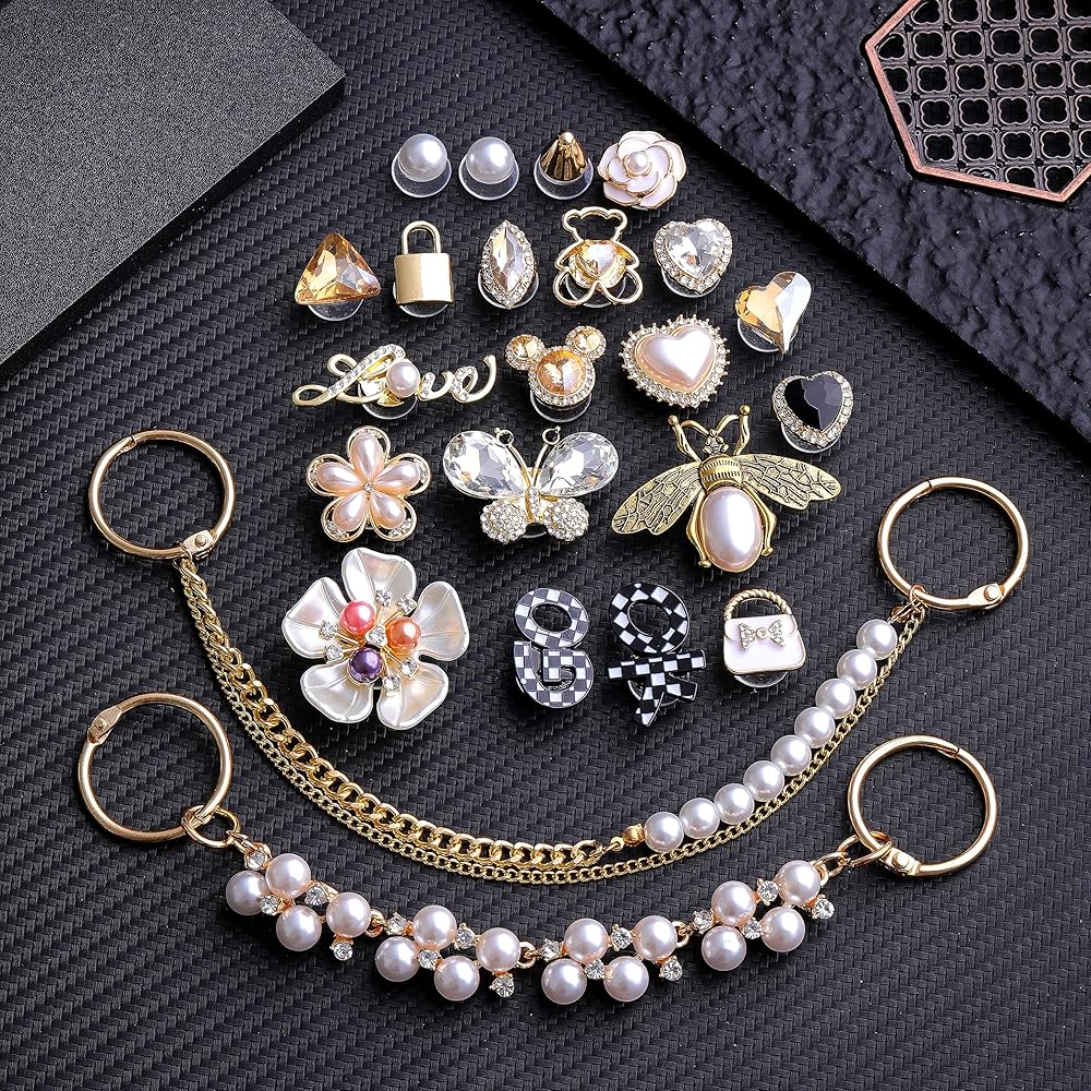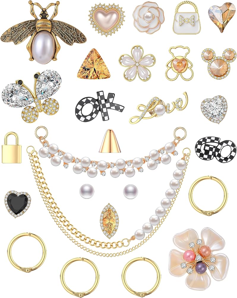 【ساحرات أحذية رائعة متنوعة】: مجموعة حليات الأحذية المكونة من 27 قطعة تجمع بين مجموعة متنوعة من عناصر الموضة، مثل اللؤلؤ والزهرة والسلاسل والفراشة والقلب والدب والميكي والنحلة والحقيبة والمزيد. هناك الكثير من قطع الأحذية الرائعة التي يمكنك مشاركتها مع صديق العائلة أو لإرضاء إبداعاتك الخاصة. تعال. قم بتزيين قباقيبك باستخدام حليات الأحذية الذهبية الخاصة بنا.