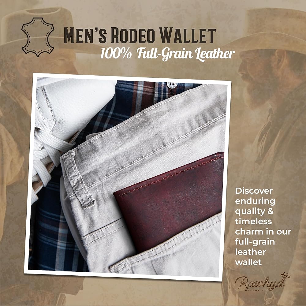 جلد محبب بالكامل وكونشو: تم تصميم محافظ روديو الخاصة بنا للرجال من الجلد من جلد الجاموس المحبب بالكامل والذي، مثل النبيذ الفاخر، يصبح أفضل مع تقدم العمر مع تطور طبقة الجلد. يضيف الجلد المغطى بالشعر مع نجمة معدنية على زاوية المحفظة الجلدية الطويلة للرجال لمسة غربية كلاسيكية.