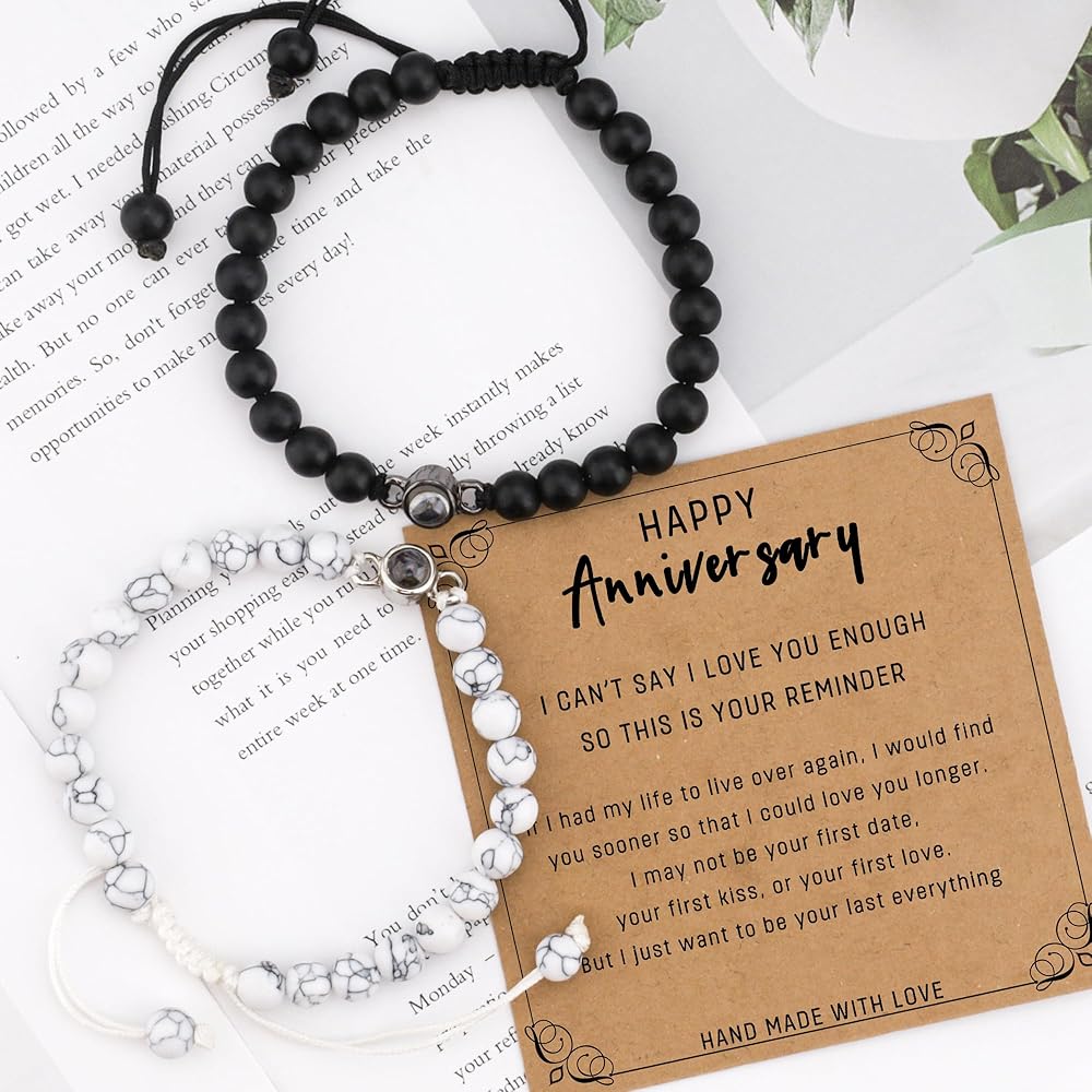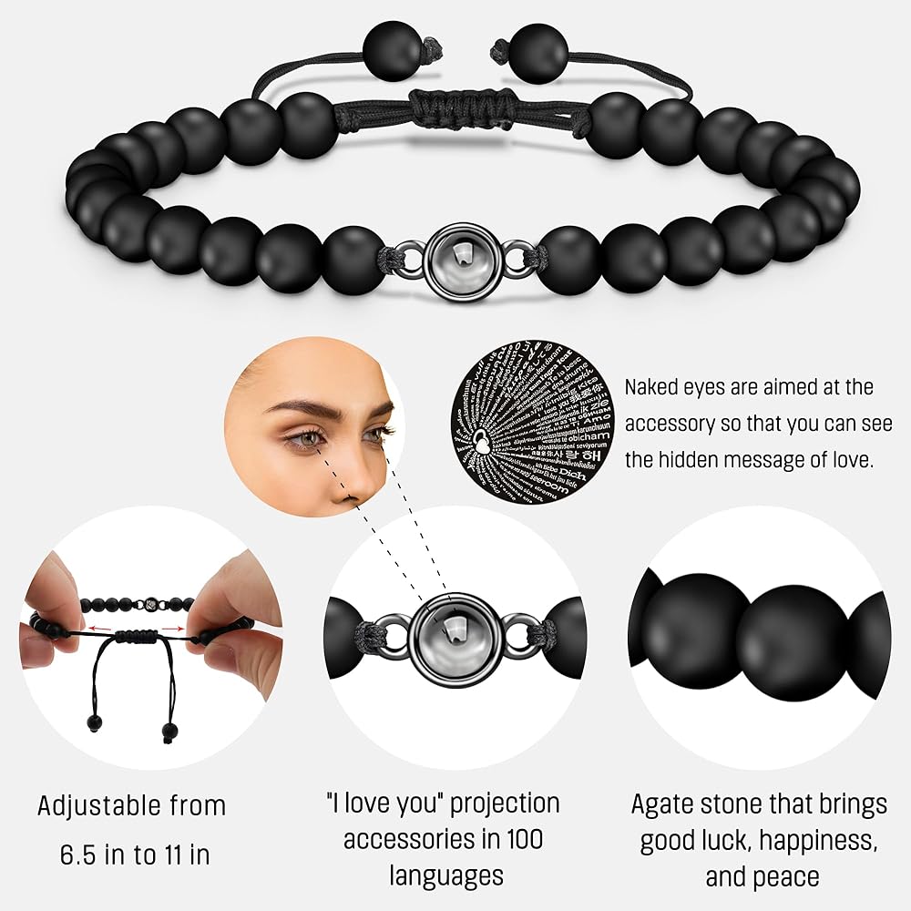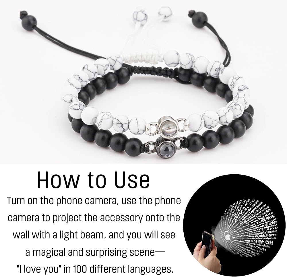 • [هدايا حب للذكرى السنوية السعيدة] —— هذه الأساور المتطابقة للأزواج منقوشة عليها أنا أحبك بـ 100 لغة مختلفة، ويمكن العثور على الأسرار المخفية من خلال حمل حجر جهاز العرض الدائري بالقرب من عينيك، يا لها من هدية غامضة وفريدة من نوعها للتعبير عنها حبك.