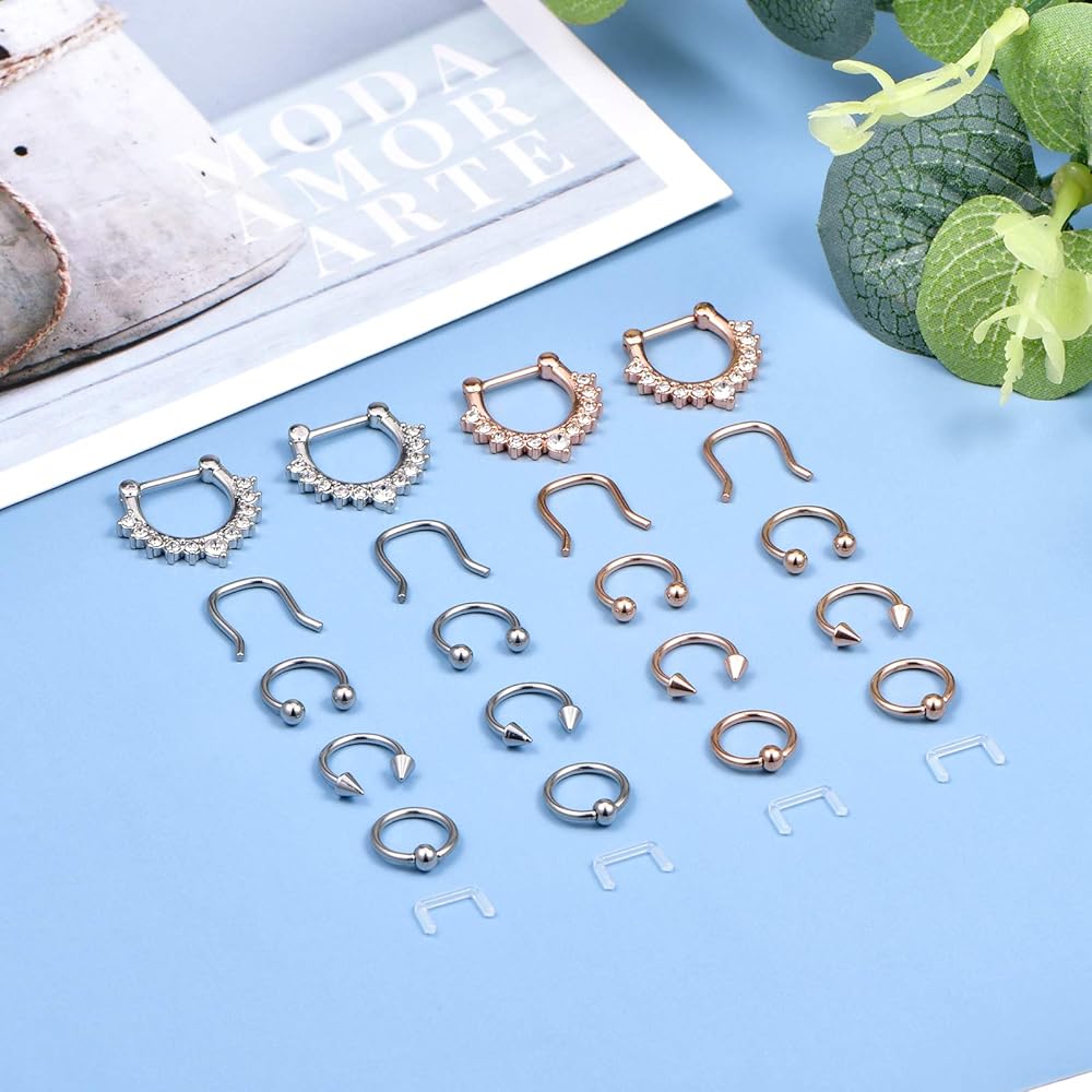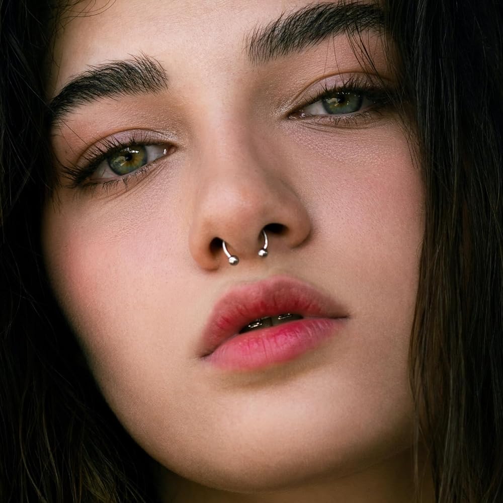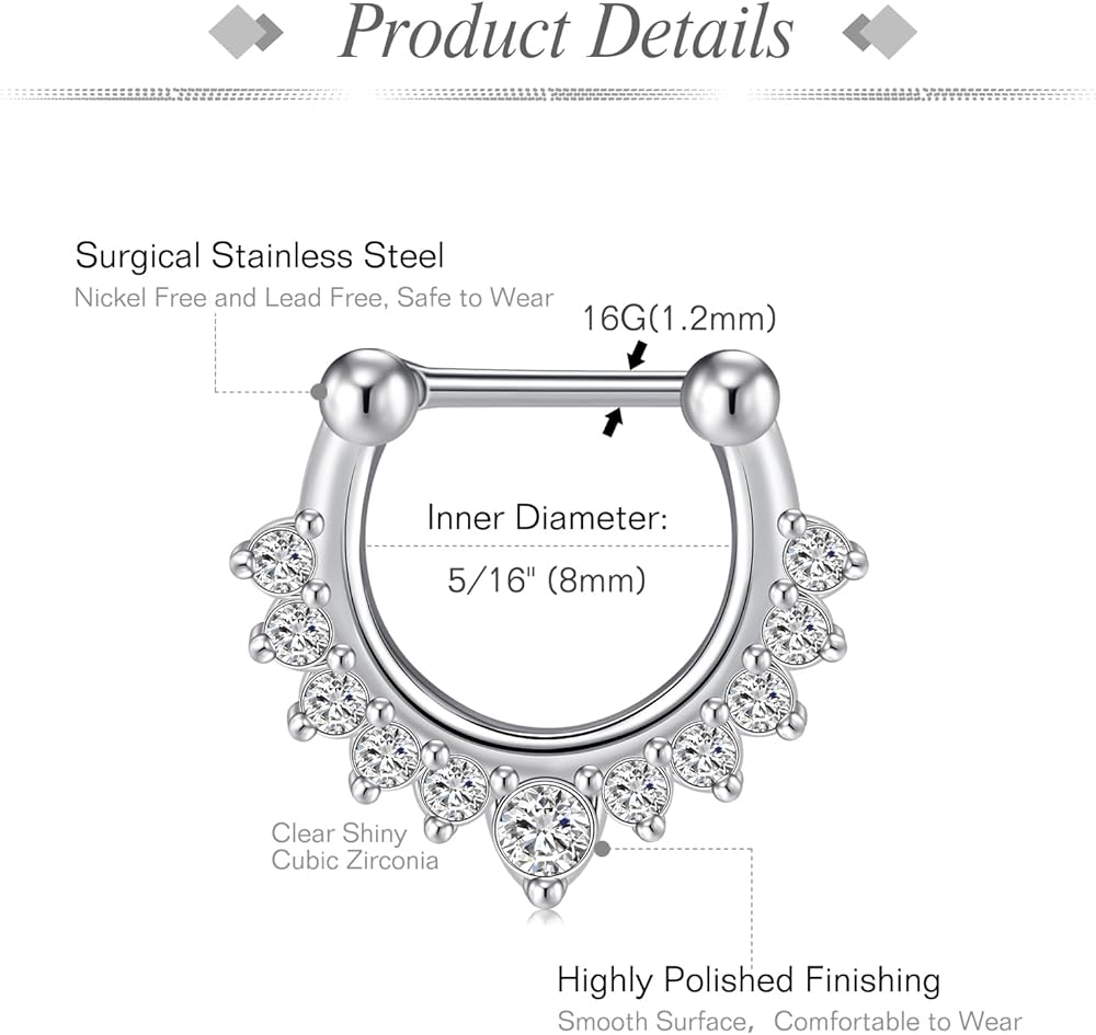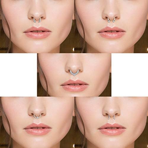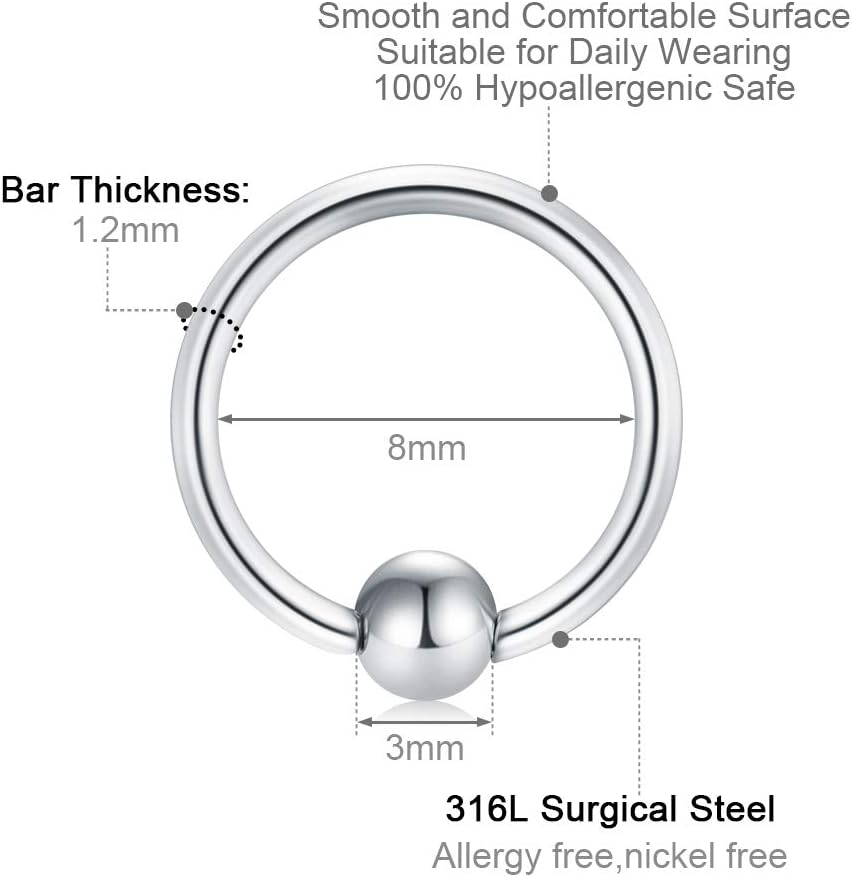 المقاس: جميع الأقراط الغضروفية بقياس 16 جرام (1.2 مم)، وأثقال منحنية يمكن ارتداؤها بطول 8 مم (5/16 بوصة)، وخواتم حدوة الحصان 8 مم (5/16 بوصة)