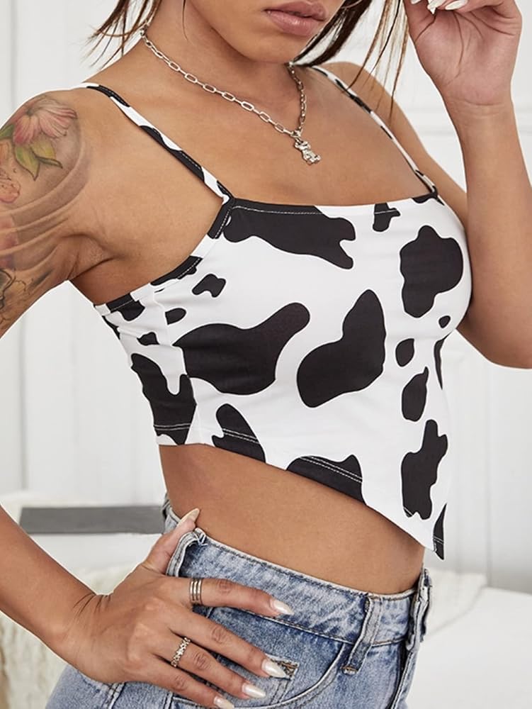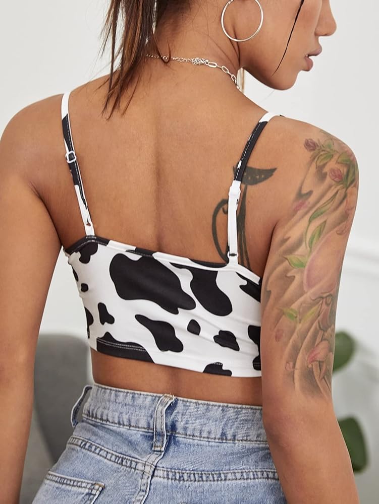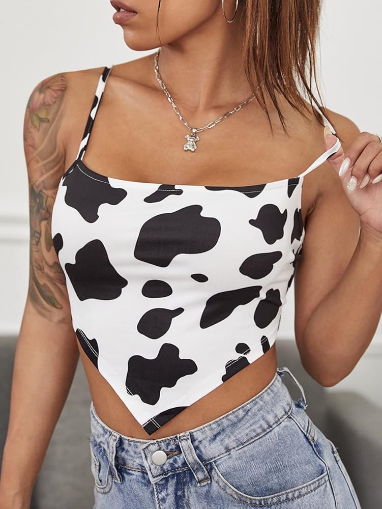 - المزايا: طباعة بقرة، حزام قابل للتعديل، جزء علوي قصير، بدون أكمام، حاشية منديل