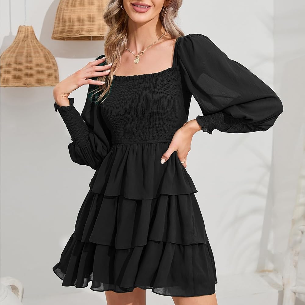 - السمات: رقبة مربعة، أشرطة مربعة بدون ظهر، مطوية، طباعة زهور، كشكشة، أكمام طويلة، مقاس نحيف، طول فوق الركبة، أساور مرنة.