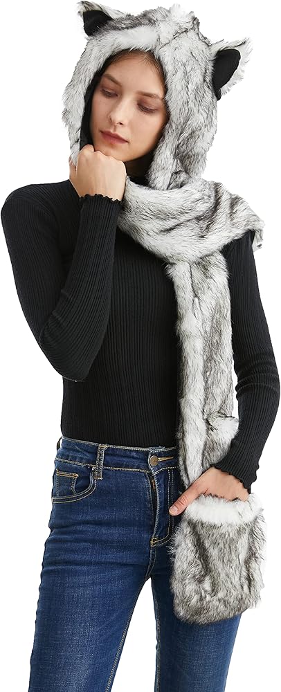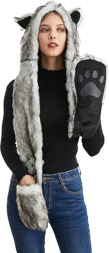 Winter Plush Hooded Faux Fur Multifunctional Animal Hat With Scarf Mitten&Paws -In-One Combo Christmas Halloween Party