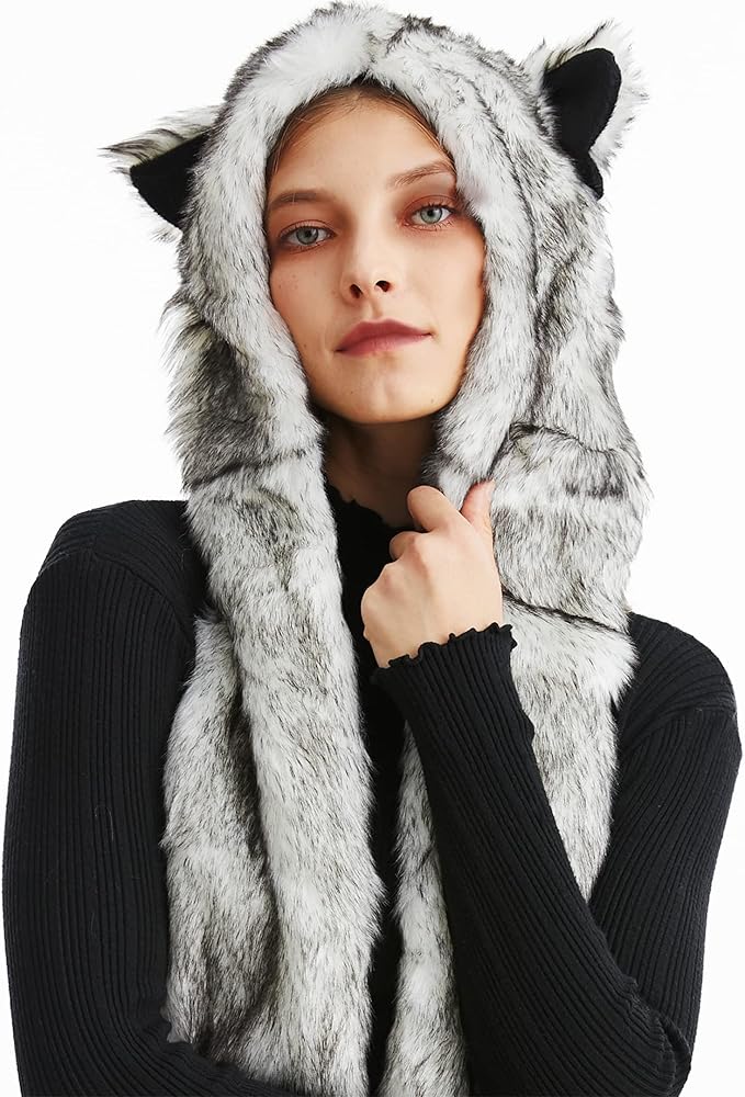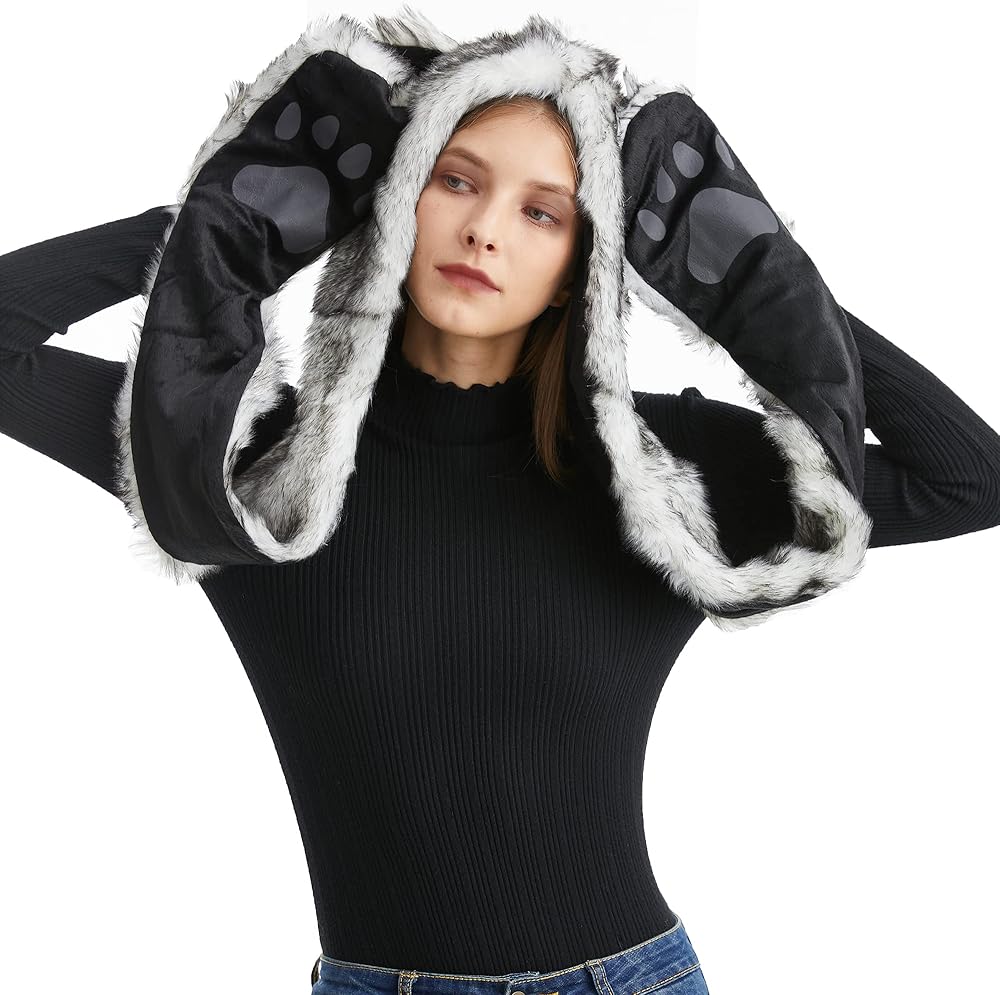 • Animal Design. Faux Fur. 3-in-1 Multi-Functional Animal Hat, Scarf & Mitten Combo. Embossed Paws and Ears Look Cute and Lovely. This animal hat is connected with long hand flaps on both sides that are worn as mittens, so you can fully cover up your whole head and hands in cozy warmth as well.