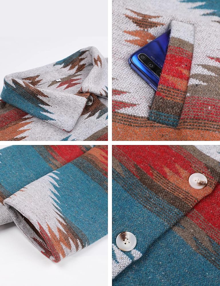 - جيبان لليدين، وياقة مطوية، وأنماط هندسية