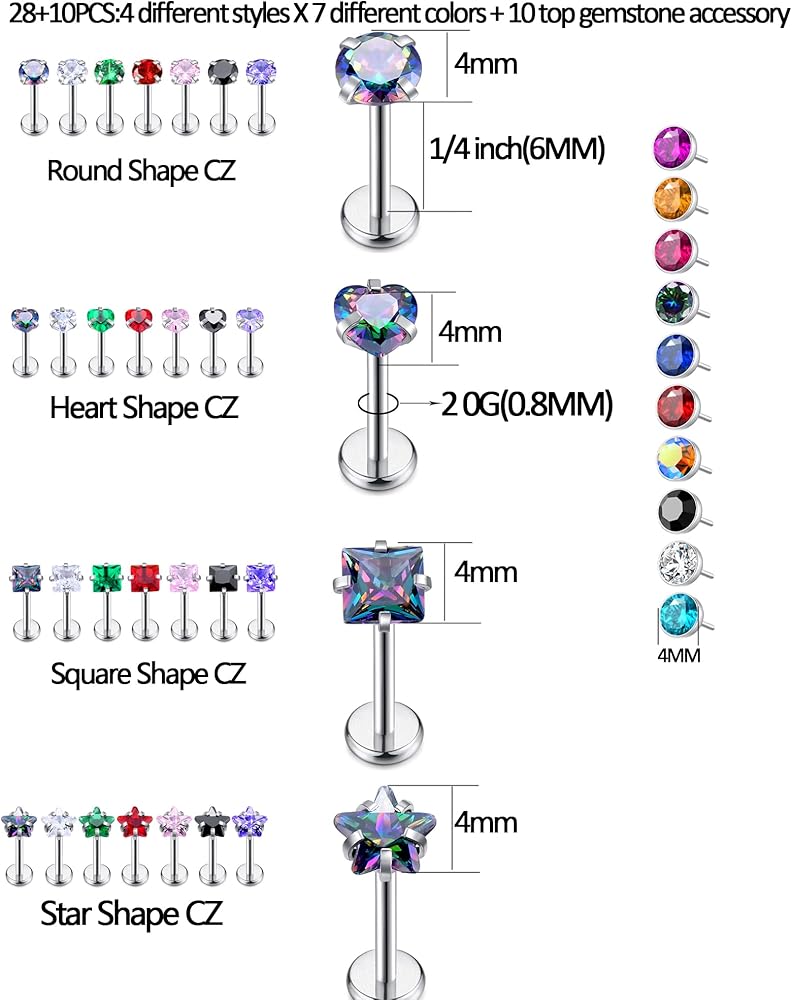 【مقاس مجوهرات ثقب الشفاه بدون خيوط】مقياس مسامير الشفاه: 20 جم (0.8 مم)، طول القضيب: 6 مم (1/4 بوصة)، مقاس الجزء العلوي CZ: 4 مم. اللون الفضي