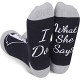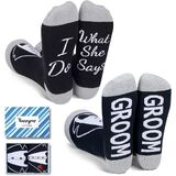 - جوارب العريس: تم تصميم هذه الجوارب السوداء بكلمة "I DO WHAT SHE SAYS" وتتميز بنمط السهرة لإضافة بعض المرح إلى ملابس زفافك.