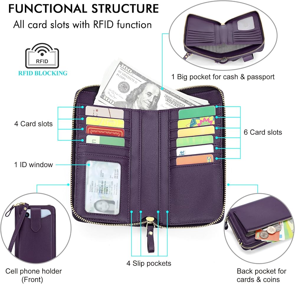 محفظة هاتف خلوي خفيفة الوزن ولطيفة وسهلة الحمل: الوزن: 4.4 أونصة / 125 جم فقط. 6 فتحات للبطاقات مع حجب RFID على الظهر مع حماية قلابة، وجيب هاتف واحد في الأمام مع حزام مطاطي يسهل إخراج الهاتف.