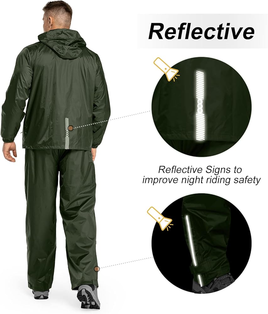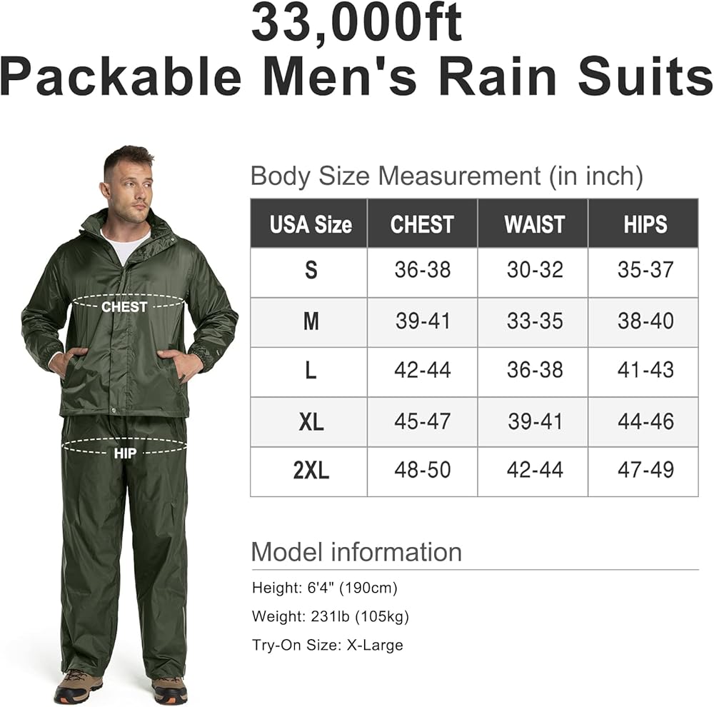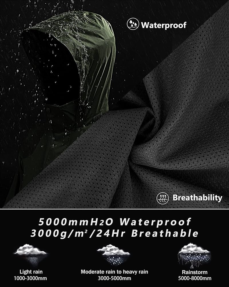 • مقاوم للماء وجيد التهوية: معدات المطر للرجال بطول 33,000 قدم مقاومة للماء وتتميز بهيكل محكم الغلق بالحرارة الكاملة، مع 5000 مم H2O في مستوى مقاوم للماء. يمكن أن يبقى جافًا في الأيام الممطرة والأيام العاصفة ويمنع فقدان الحرارة. كما أنها مصنوعة من بطانة شبكية تتيح لك ارتداء ملابس أكثر راحة وروعة. معدل التهوية: 5000 جم/م2/24 ساعة.