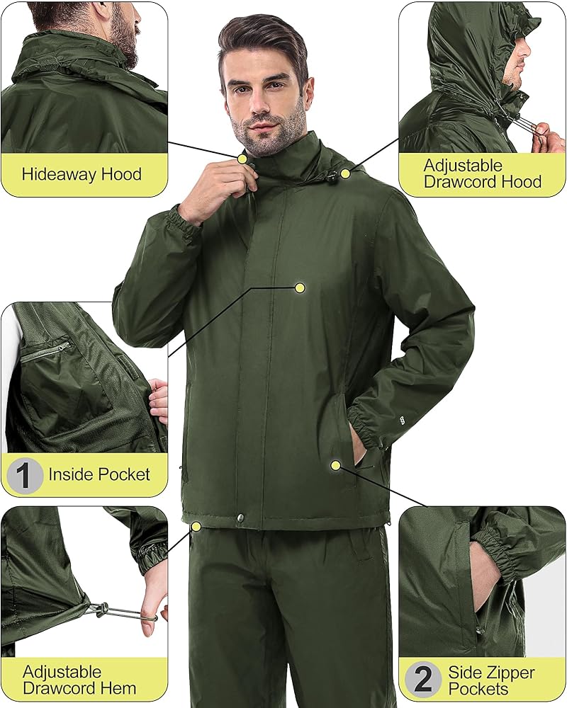• سترات المطر الرجالية: بدلات مطر بطول 33,000 قدم للرجال مقاومة للماء تتميز بغطاء رأس مخفي من سترات المطر تناسب مناسبات مختلفة، يمكنك تخصيص مظهرك وتقرر بسهولة متى تحتاج أو لا تحتاج إلى غطاء رأس. أطراف أكمام مرنة، غطاء رأس برباط قابل للتعديل، الحاشية تحتوي على حبل مرن لمنع نفسك من البلل.