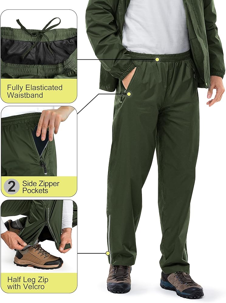 • سراويل المطر الرجالية: معدات المطر للدراجات النارية بطول 33,000 قدم للرجال عبارة عن حزام خصر مطاطي بالكامل مع رباط بداخله يساعدك على تخصيص مقاسك حول الخصر. وسحاب نصف الساق، يسمح لك بسحب الملابس فوق حذائك من أجل السرعة. يسمح إغلاق الفيلكرو في الجزء السفلي من الساق بتعديل العرض ليناسب المقاسات والمناسبات المختلفة.