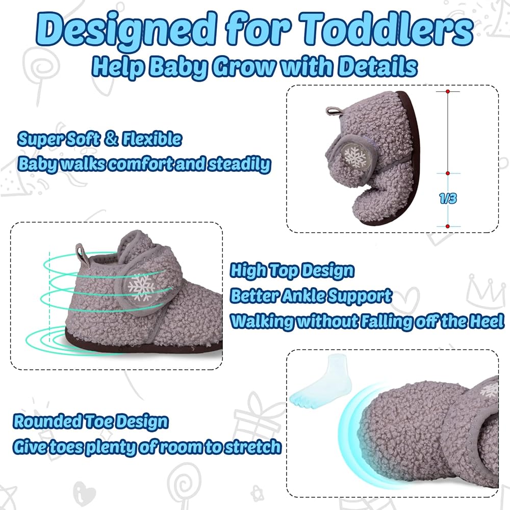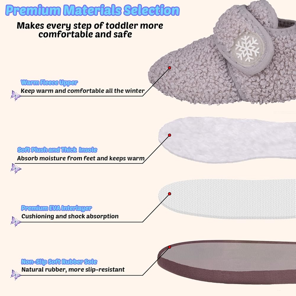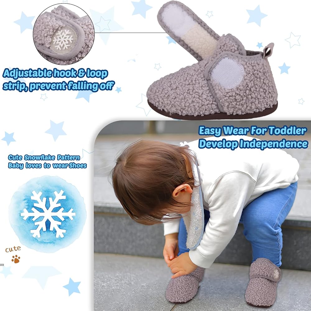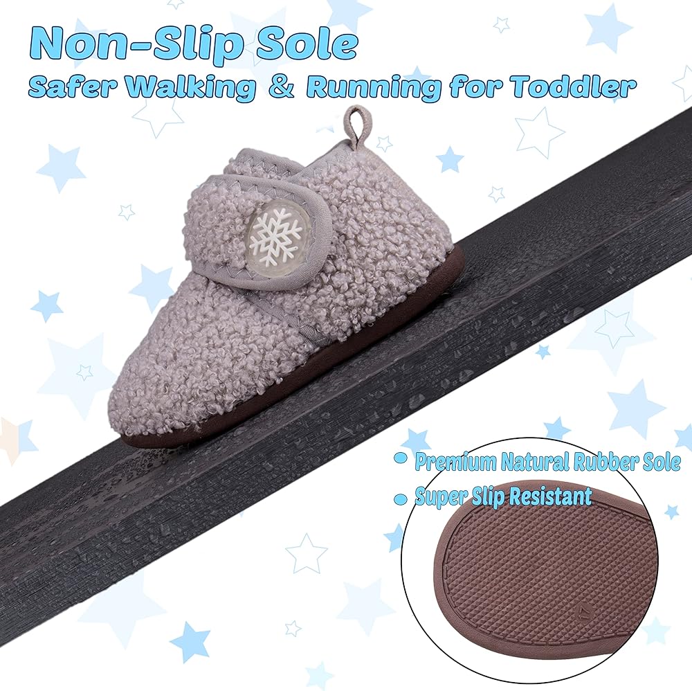 سهل الارتداء: شباشب منزلية للأطفال الصغار مزودة بخطاف وحلقات إغلاق واسعة ومتينة مما يجعل من السهل جدًا على الأطفال ارتداءها وخلعها بمفردهم، والأهم من ذلك، أنها تساعد الأطفال على أن يكونوا أكثر استقلالية. أشرطة لاصقة وحلقة قابلة للتعديل مع ارتفاع تصميم علوي لملاءمة أكثر إحكامًا، إغلاق مشط القدم يجعل المشي أكثر راحة للأطفال الصغار ويمنع سقوط الكعب. تتم طباعة أحزمة الخطاف والحلقة برقائق ثلج لطيفة سيحب الطفل ارتدائها.