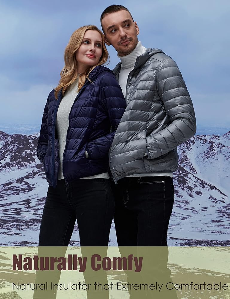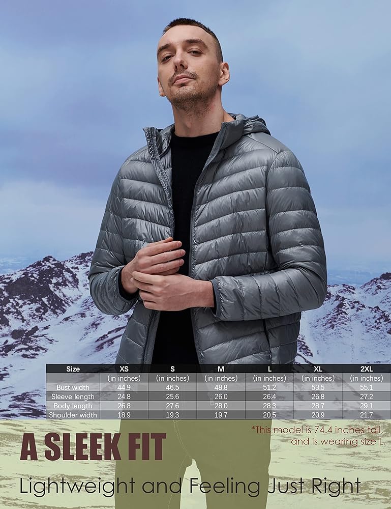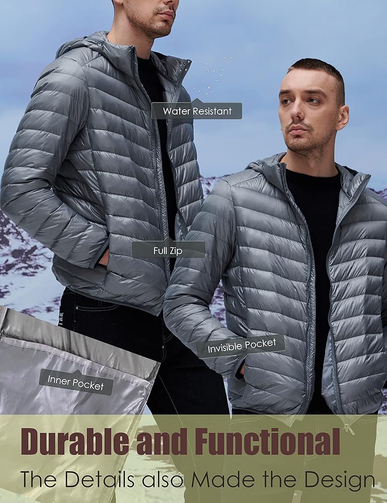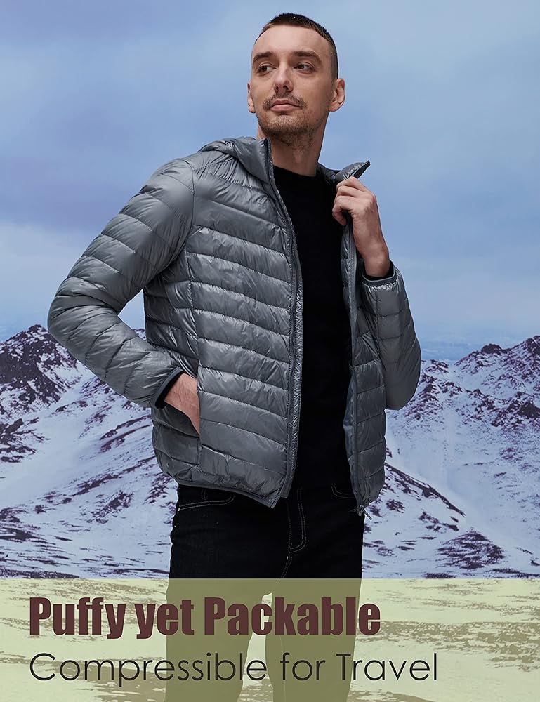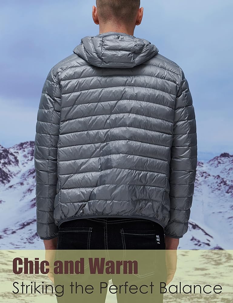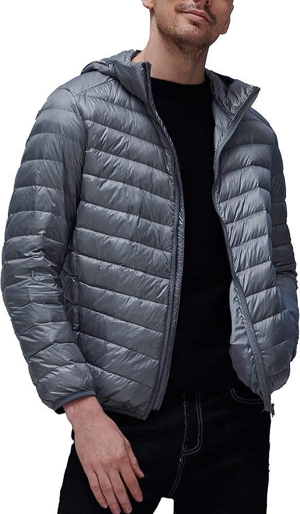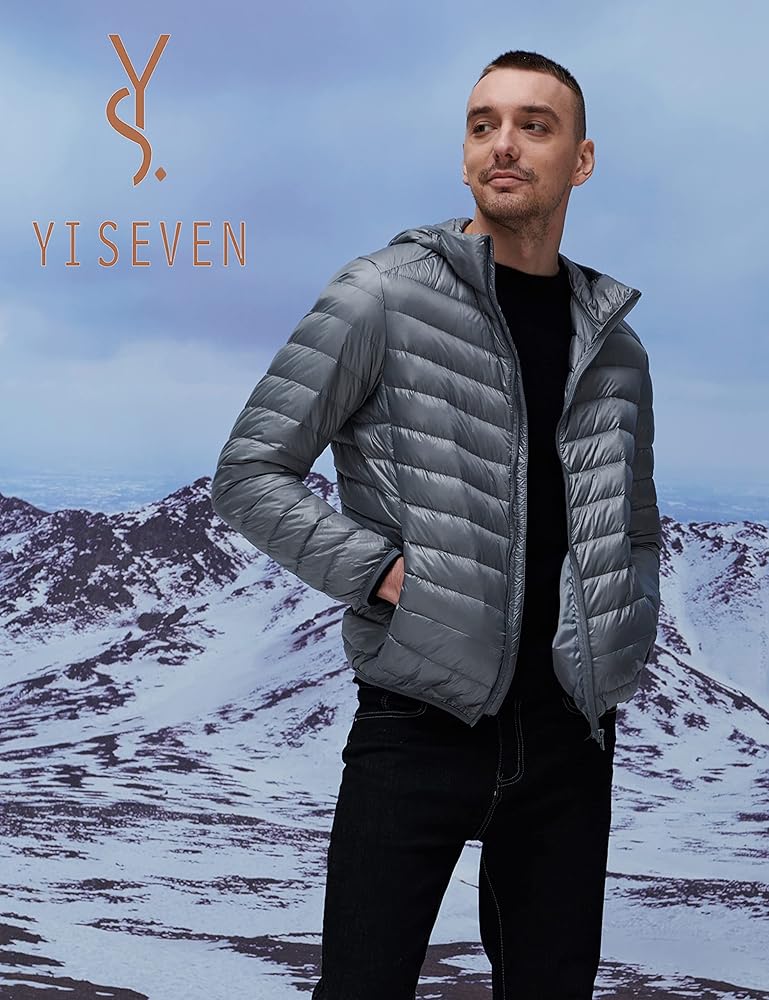 YISEVEN للرجال خفيف الوزن ومقاوم للماء وقابل للتعبئة ومعطف بغطاء للرأس ومناسب نحيف ومسامي ومنتفخ ومبطن ودافئ للشتاء البارد والتزلج في الهواء الطلق والسفر اليومي، هدية رئيسية، مقاس M رمادي
