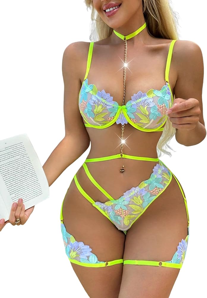 طقم لانجري نسائي من WDIRARA مكون من 3 قطع مزين بالزهور وشبكة متباينة بدون أكمام