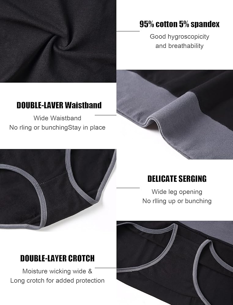 [نسيج قطني مريح وصديق للبشرة] - يجب أن تكون الملابس الداخلية صديقة للبشرة وناعمة ومريحة، والملابس الداخلية القطنية هي الخيار الجيد. الملابس الداخلية القطنية مريحة بشكل خاص عند ارتدائها على الجسم. يتمتع القطن بنفاذية جيدة للهواء، مما يحافظ على جفاف الأجزاء الخاصة بك طوال اليوم دون أن يكون خانقًا. سراويل داخلية قطنية بدون ربط أو حشو، لا تحفر في الجلد أو تشوه، خطوط الدرزات ناعمة ولا تسبب التهيج.