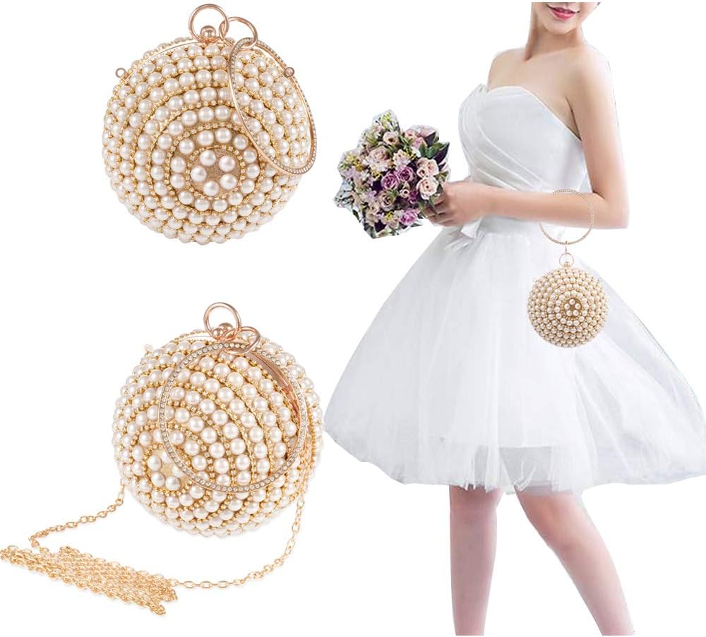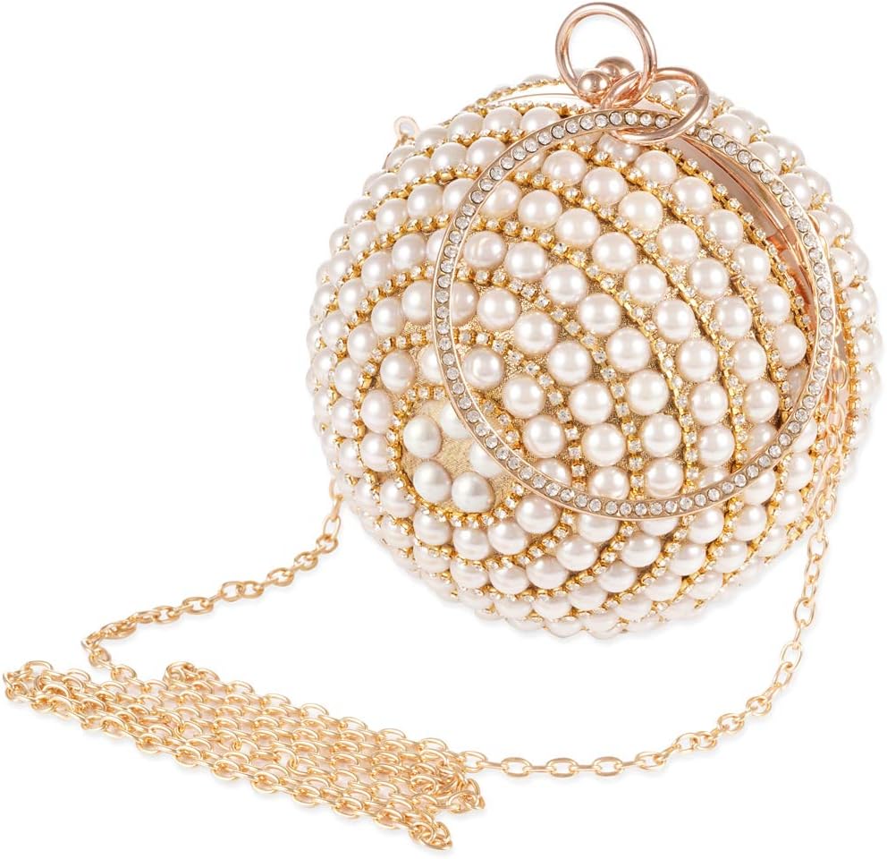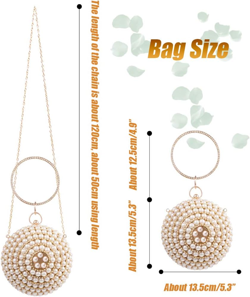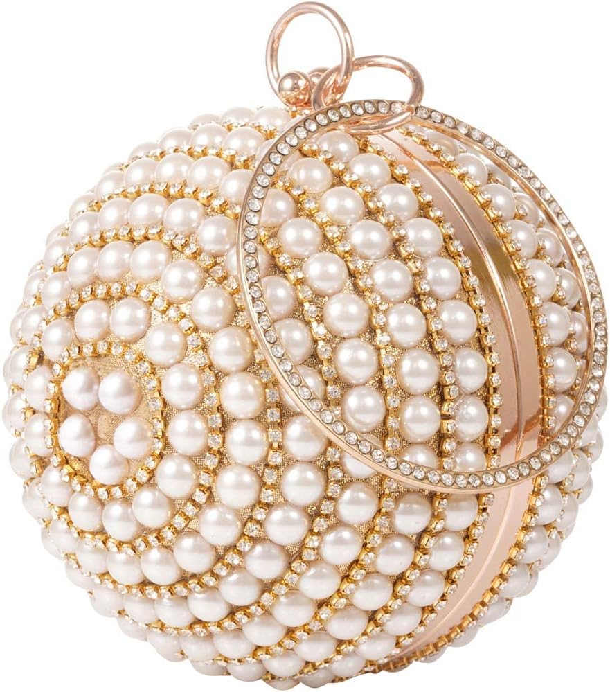LONGBLE is a shop dedicated to various kinds of woman clutch evening bags. Our unique fashionable round ball is easy to handle with a big circle ring. Stunning as a evening party bag, it will be eye-catching. Features: Material: Strong metal frame, synthetic fabric surface, artificial pearls and rhinestone decor.Size: Φ13.5cm /5.3”.Color: Gold with ivory pearls decor.Size of Chain: about 120cm unfolded, about 50cm using length. Note: 1. With the difference in measurement method, please allow 0.1-1 inches in size and weight deviation.2. Due to differences between monitor displays, actual color may vary slightly from image.