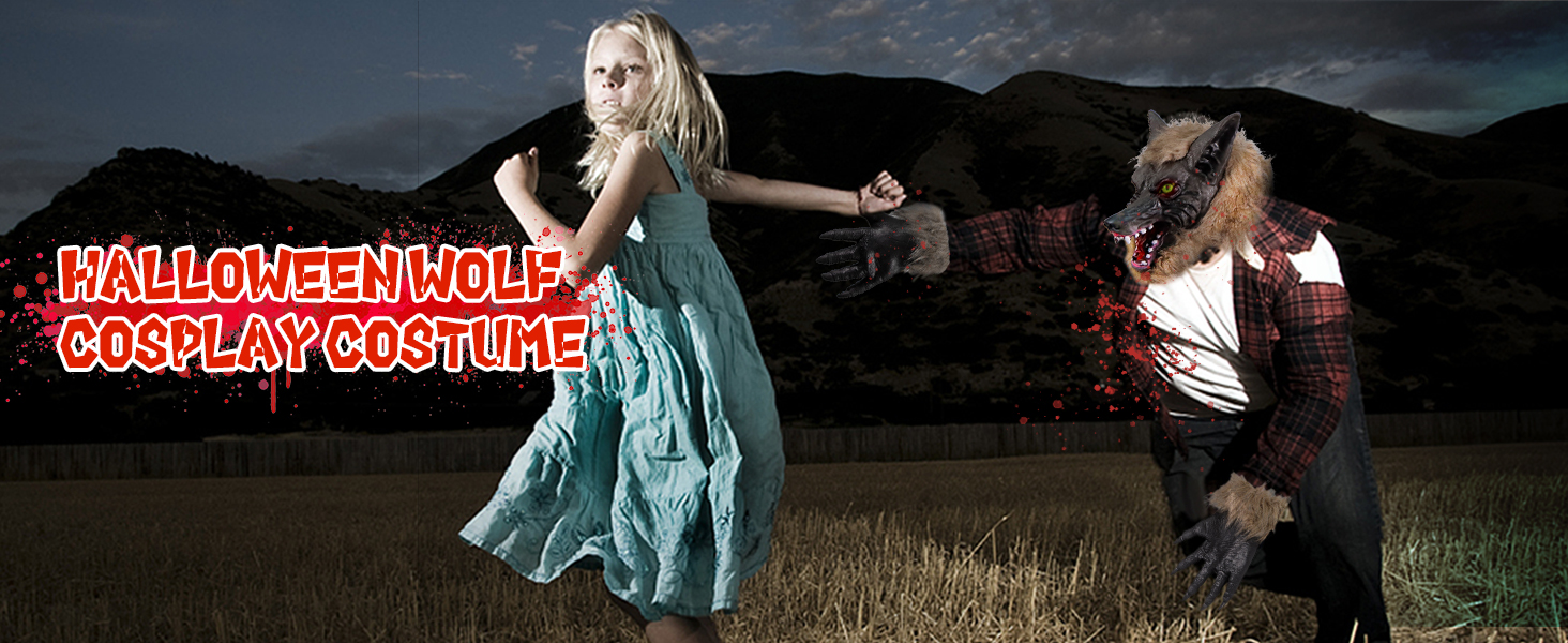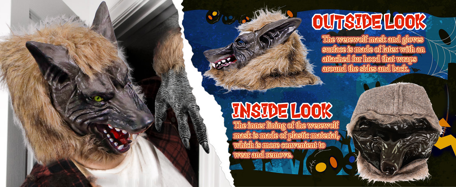 【 خامة عالية الجودة】سطح زي المستذئب مصنوع من اللاتكس مع غطاء فرو مرفق يلتف حول الجوانب والظهر. والجزء الداخلي مصنوع من مادة بلاستيكية، وهي أكثر ملاءمة للارتداء والإزالة.