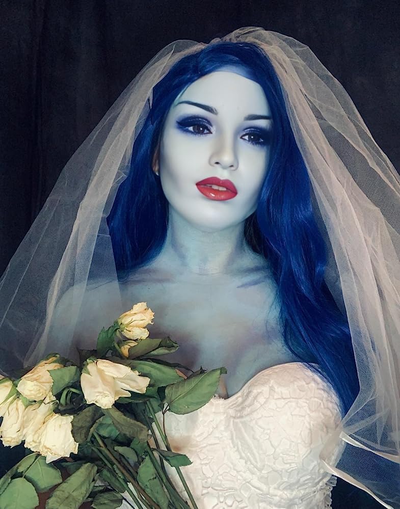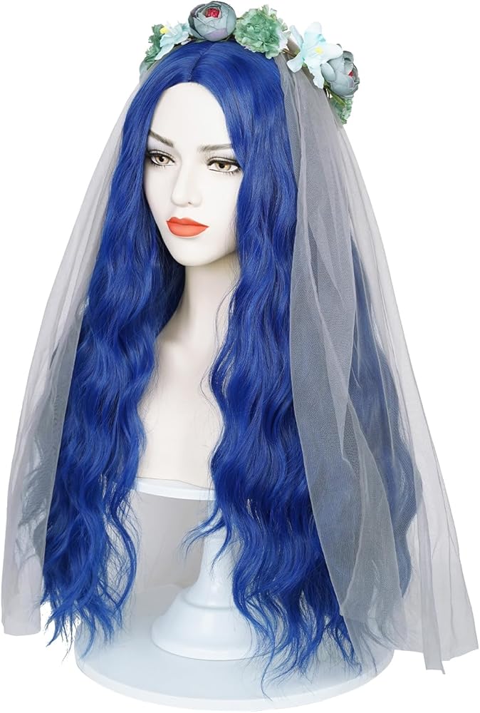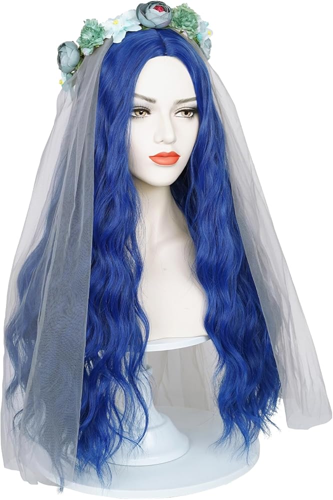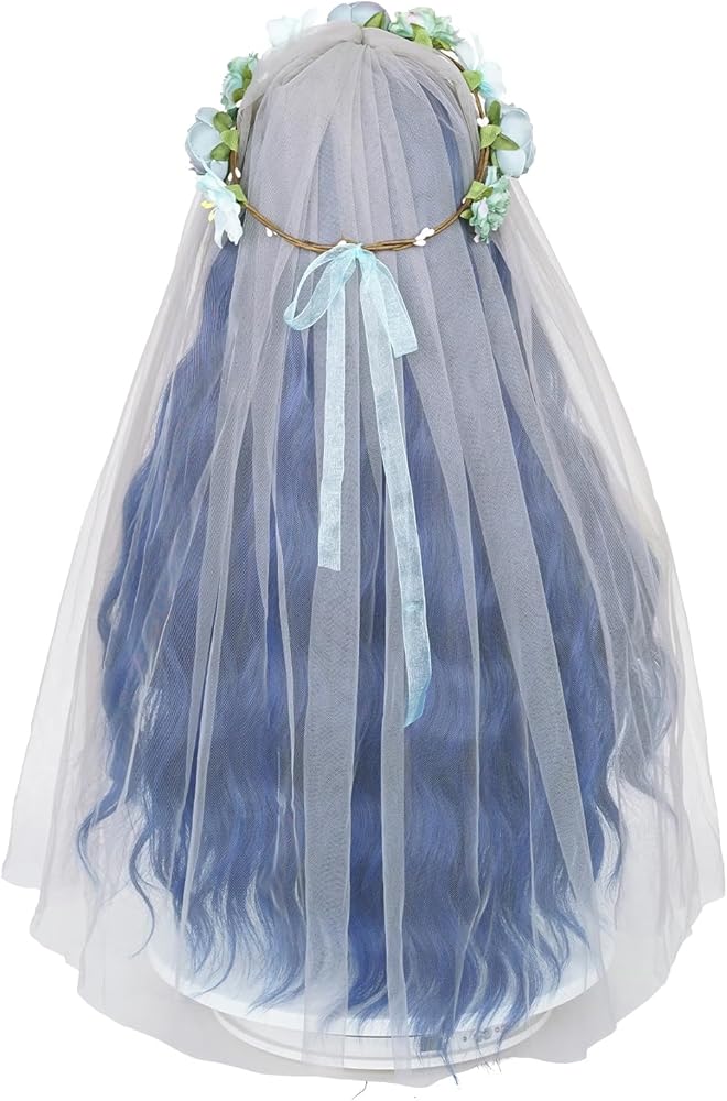 شعر مستعار العروس الأزرق لزي الجثة، شعر مستعار طويل مموج مع حجاب العروس وتاج الزهرة + قبعة شعر مستعار لحفلات الهالوين