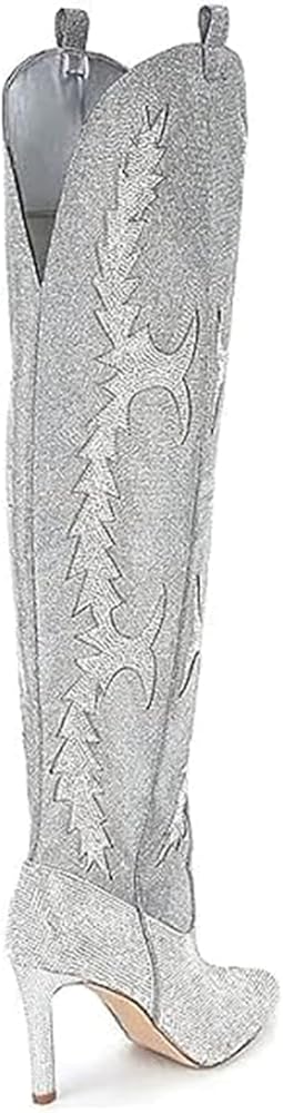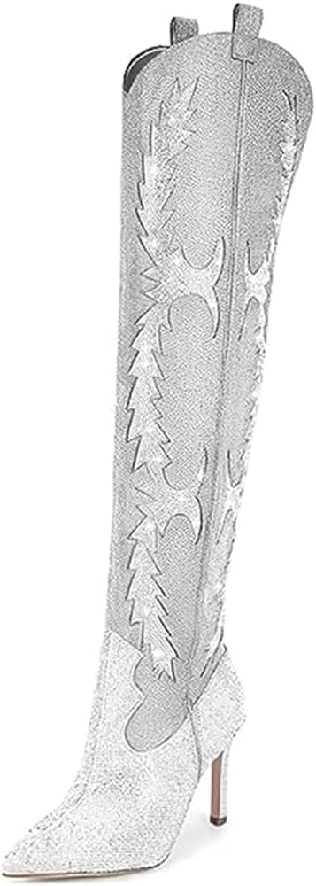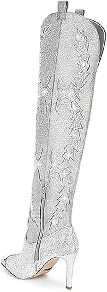 التصميم: أحذية براقة عالية الفخذ لها كعب مثير للغاية بطول 8 سم، ومقدمة مدببة؛ مرصعة بأحجار الراين اللامعة لتطريزها والحصول على سحاب جانبي لسهولة الارتداء والخلع. متعددة الاستخدامات وأنيقة للغاية.