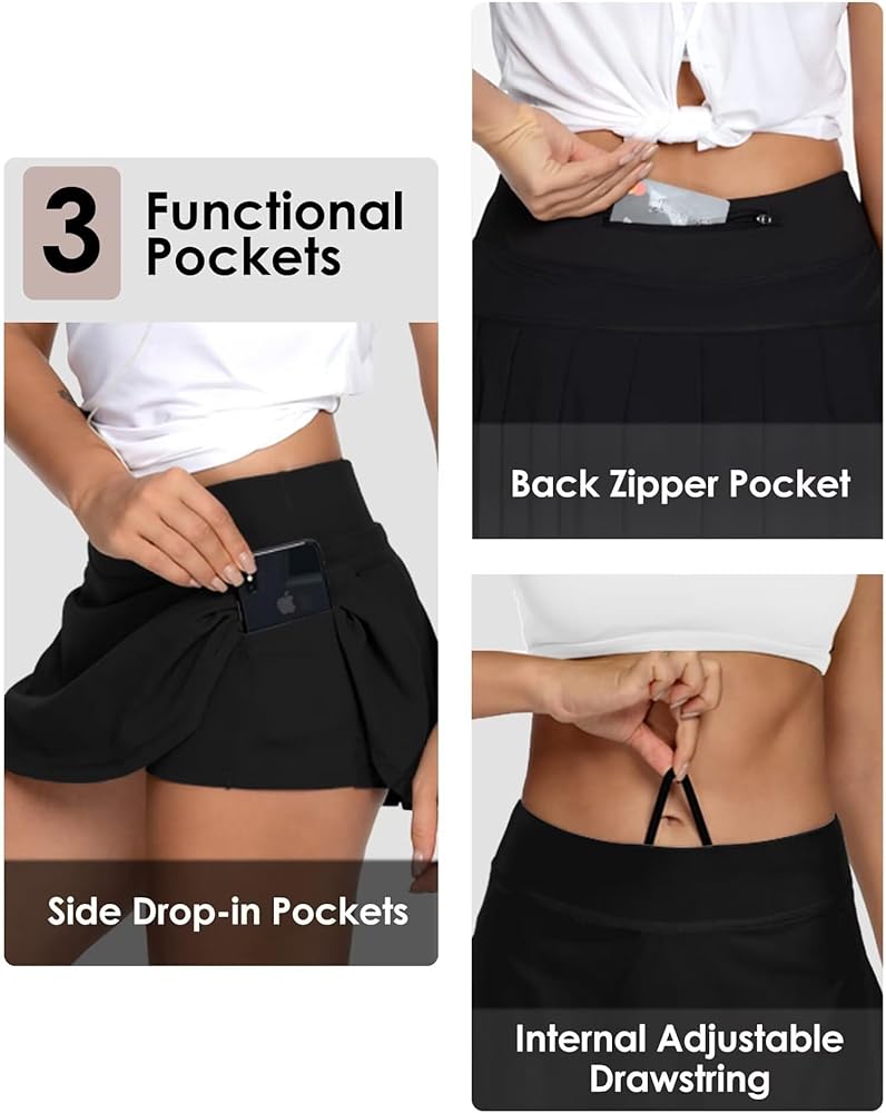 【جيوب متعددة الاستخدام في البطانة】يوجد جيبان شبكيان متعددا الاستخدامات في بطانة شورت تنورة التمرين. جيب مزدوج المدخل يحمل كرة تنس وهاتفك، إلخ.