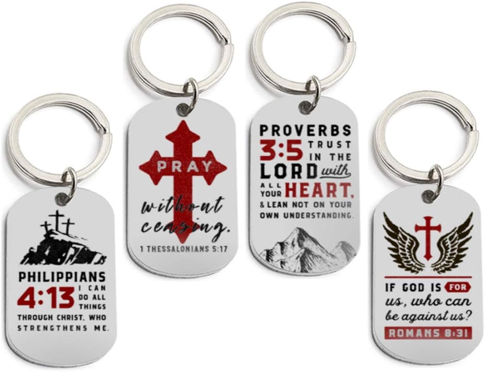 عبوة من 12 سلسلة مفاتيح ملهمة على شكل كلب مسيحي مع آيات مقدسة شائعة حول موضوعات الإيمان والصلاة والحماية. تتضمن هذه المجموعة المتنوعة 3 قطع من كل آيات الكتاب المقدس التالية: فيلبي 4: 13 (يمكنني أن أفعل كل شيء من خلال المسيح)، أمثال 3: 5 (ثق في الرب من كل قلبك)، رومية 8:31 (إذا كان الله لنا، فمن يمكن أن يكون ضدنا؟ )، و1 تسالونيكي 5:17 (صلوا دون توقف).