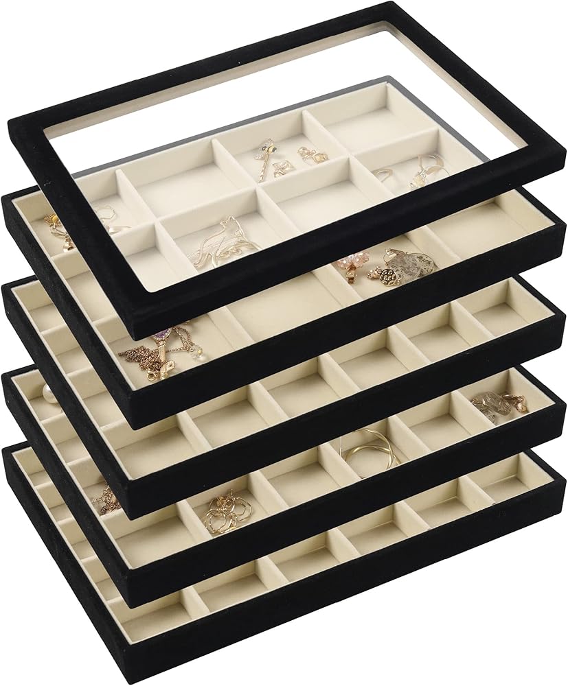 4 عبوات من صواني المجوهرات القابلة للتكديس مع غطاء لعرض المجوهرات، منظم درج خزانة الملابس، صندوق تخزين للخواتم والاقراط والاساور والقلائد والاكسسوارات