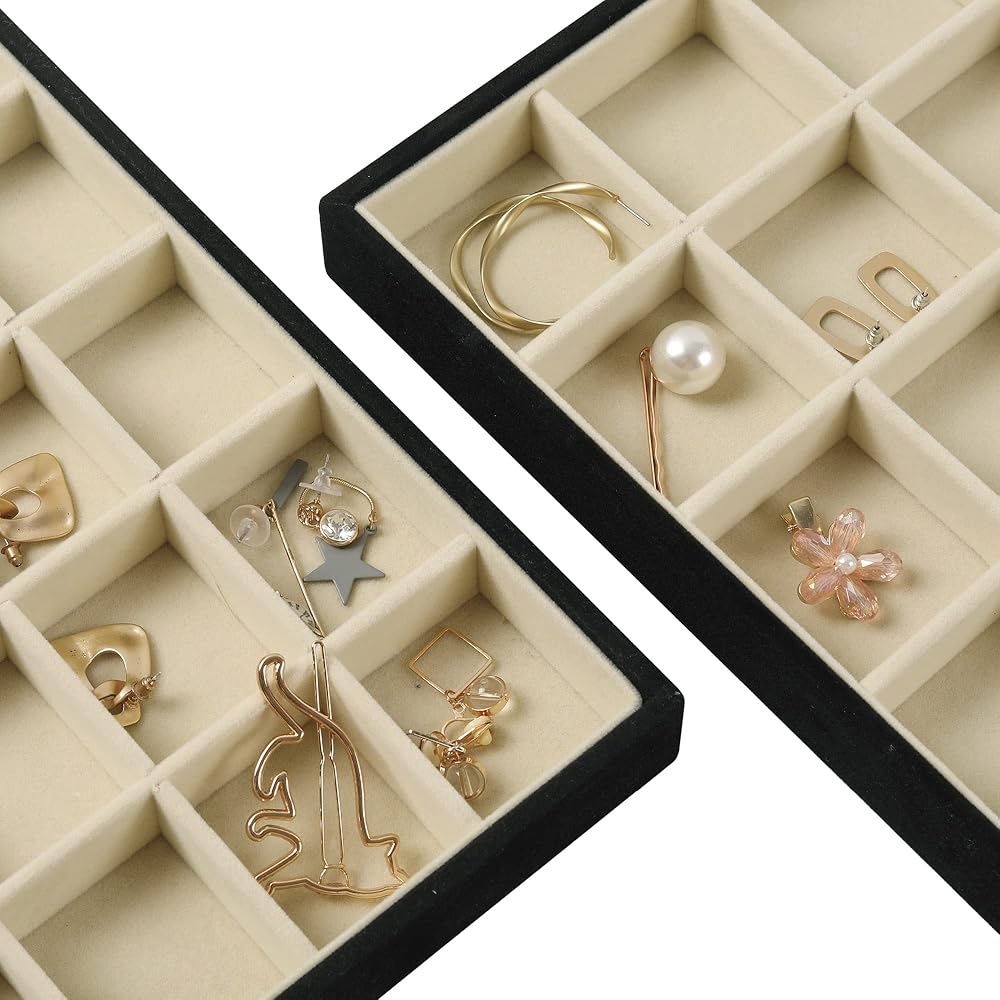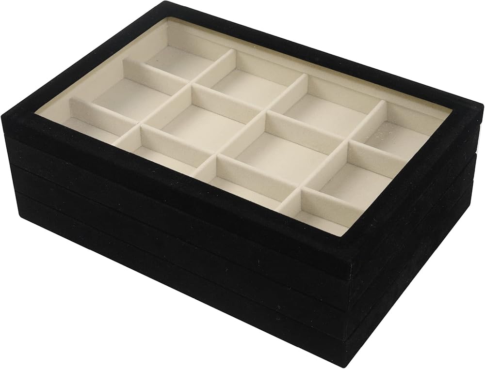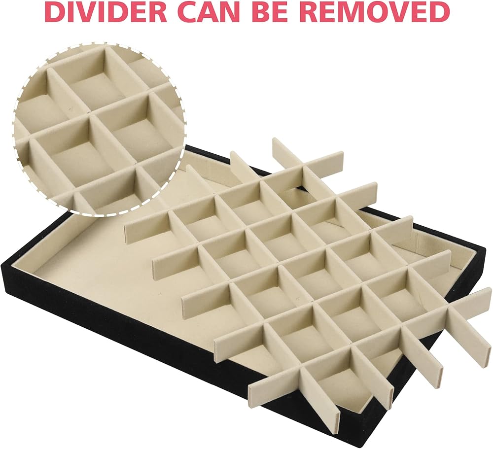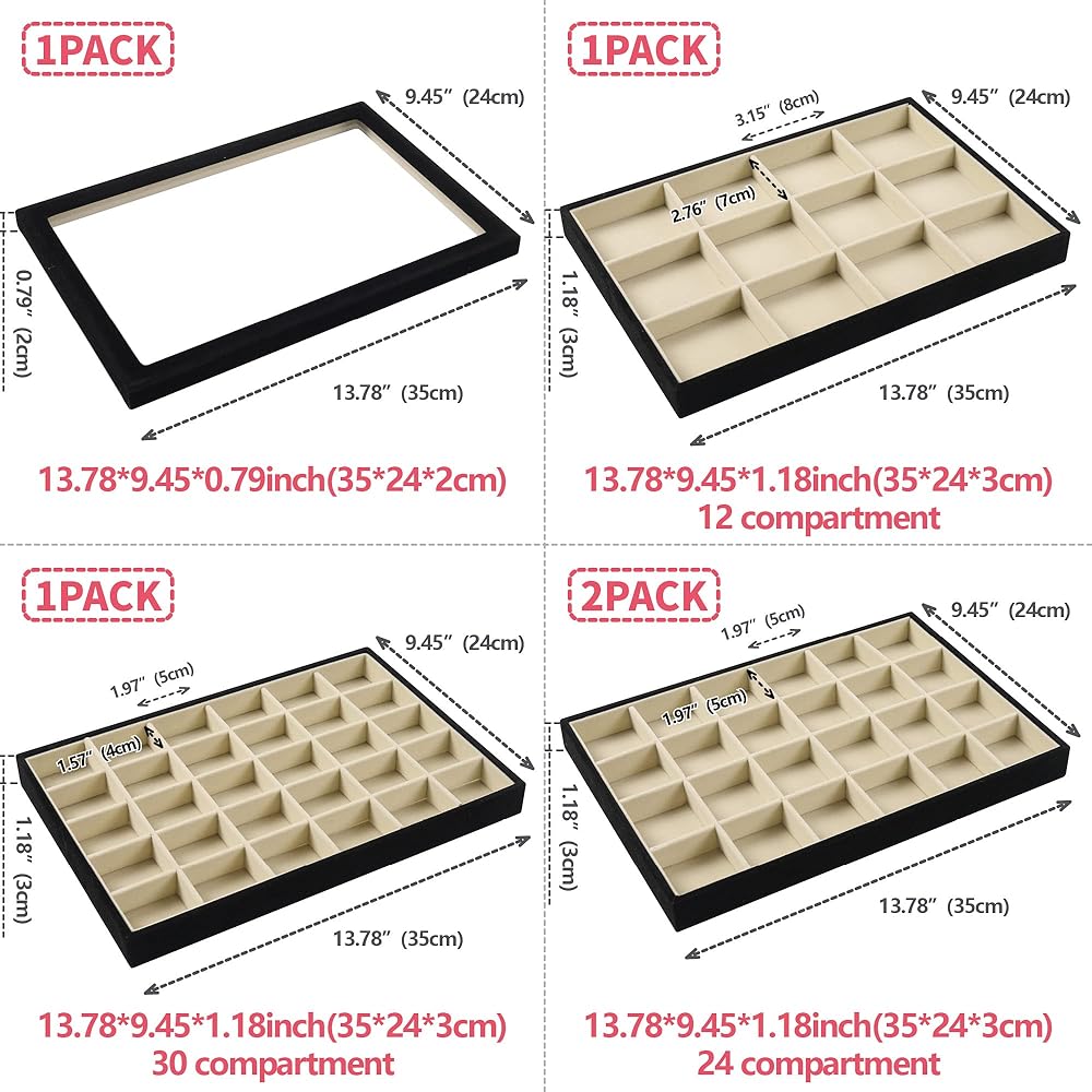 • مجموعة من 4 قطع: تتضمن المجموعة صينية 30 حجرة (عبوة واحدة)، صينية 24 حجرة (عبوتان)، صينية 12 حجرة (عبوة واحدة)، غطاء (عبوة واحدة). مثالية للأقراط والخواتم والأساور والقلائد.