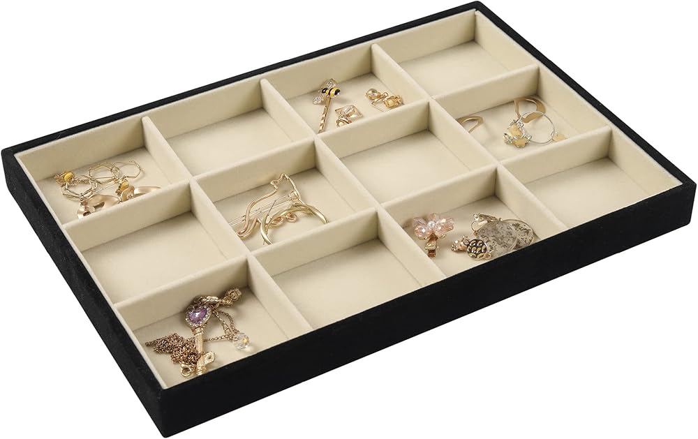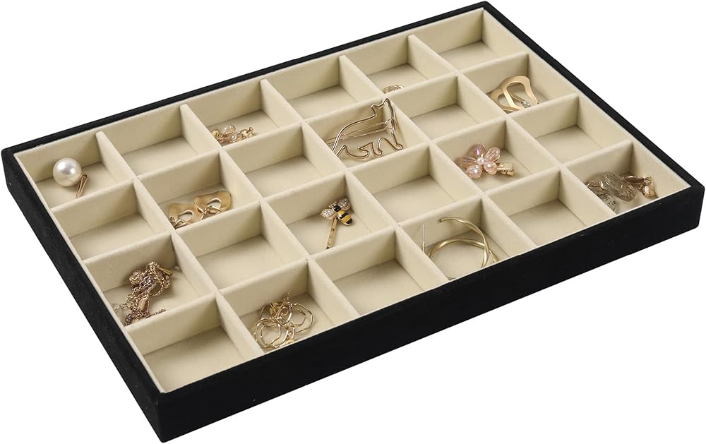 مجموعة من 4 قطع: تتضمن المجموعة صينية 30 حجرة (عبوة واحدة)، صينية 24 حجرة (عبوتان)، صينية 12 حجرة (عبوة واحدة)، غطاء (عبوة واحدة). مثالية للأقراط والخواتم والأساور والقلائد.