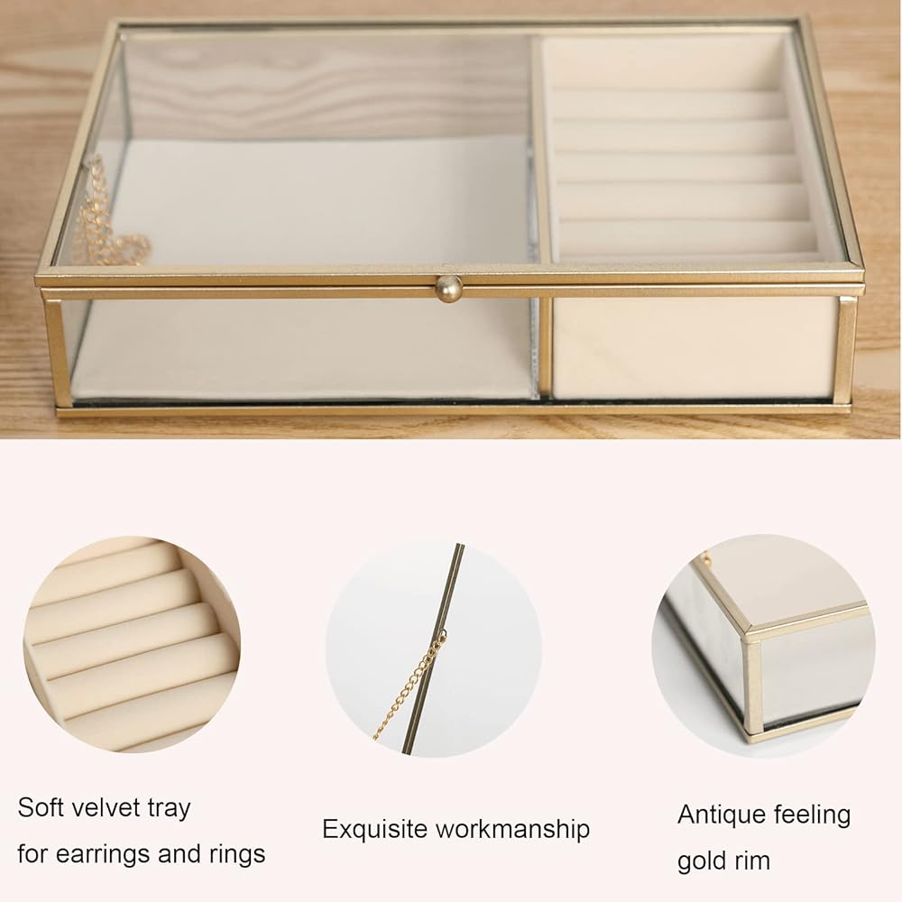• ديكور منزلي أنيق: لن يحافظ فقط على جميع مجوهراتك منظمة ومحمية بمزيج من أجود أنواع الزجاج واللحام، بل سيضيف أيضًا المزيد من السحر إلى غرفتك بتصميمه الأنيق، هذا الصندوق الزجاجي يسمح لك بالإعجاب بمجوهراتك عندما تكون خلعهم.