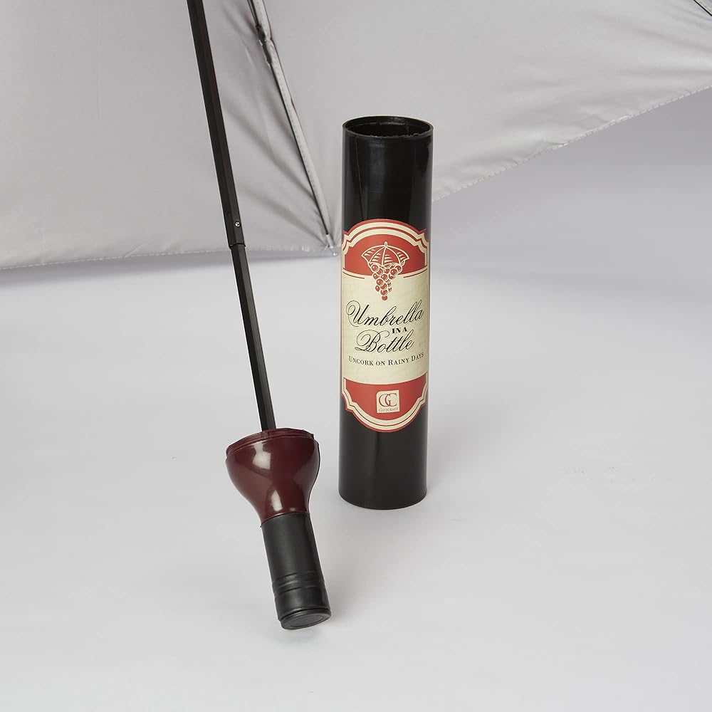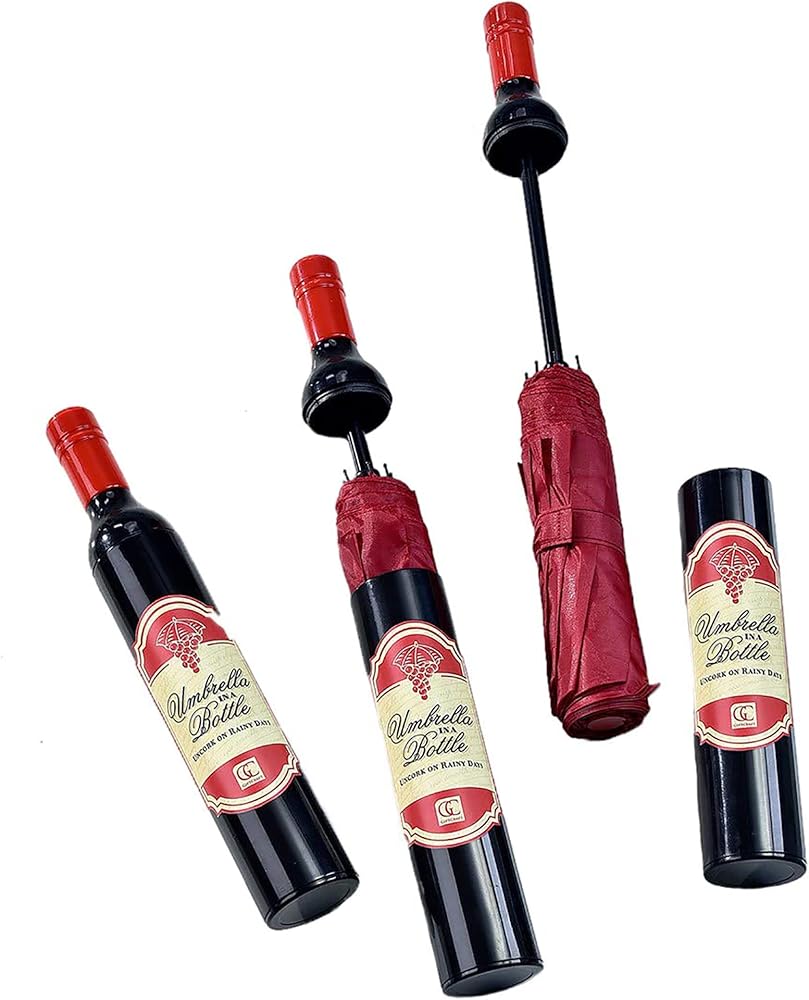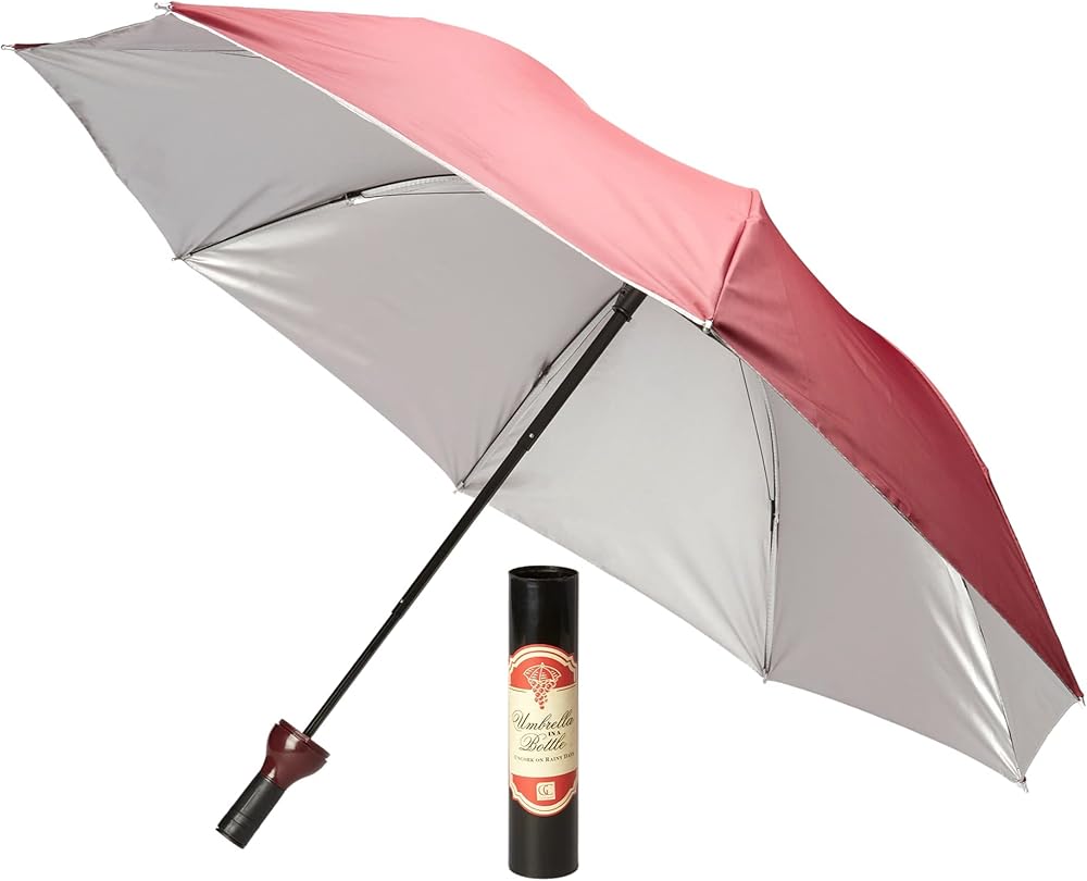 • UNCORK للأيام الممطرة: مظلة حمراء صغيرة الحجم بحجم السفر في علبة زجاجة نبيذ تبقيك جافًا وتحمي من المطر وتأتي مع غطاء بتصميم زجاجة نبيذ ممتع.