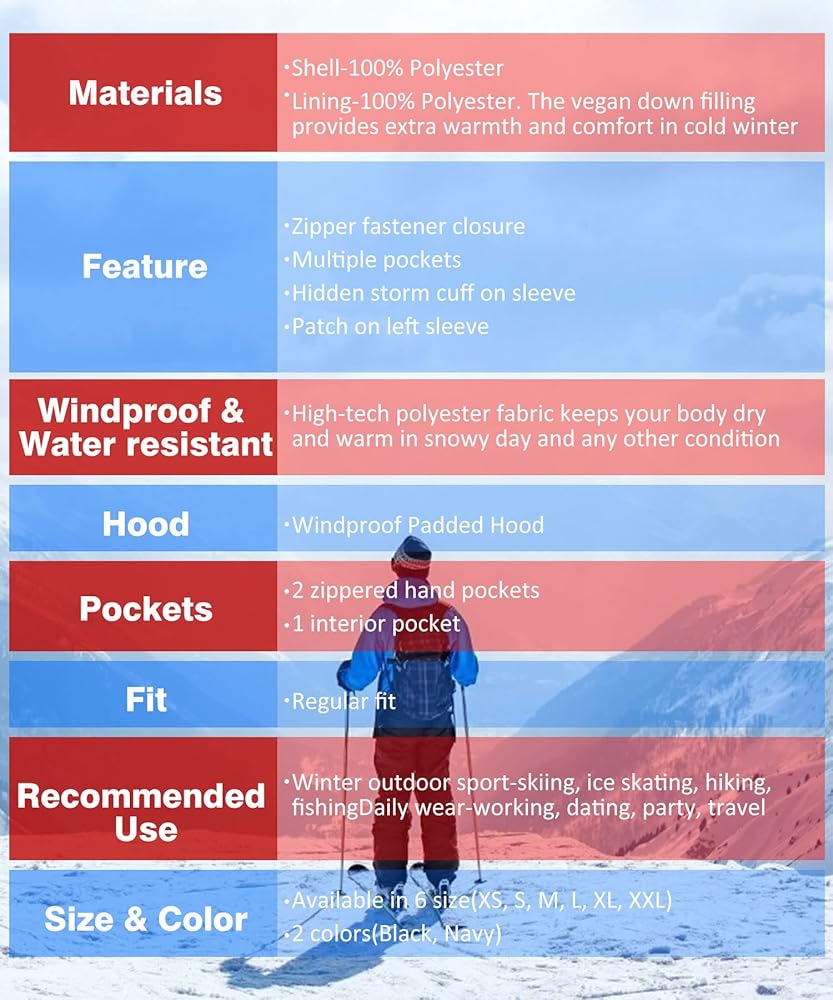 تصميم كلاسيكي: المعطف النباتي خالٍ من الحيوانات، وهو مصمم بمقاس عادي؛ رقعة على الكم الأيسر؛ سحاب ثنائي الاتجاه لسهولة الحركة؛ جيوب متعددة معزولة (جيبان من الصوف لليدين وجيب داخلي على الصدر)؛ أصفاد عاصفة مخفية للحفاظ على الحرارة ومنع تدفق الرياح الباردة. السترة الشتوية مناسبة للارتداء اليومي مثل العمل والمواعدة. كما أنه مثالي للرياضات الخارجية، مثل التزلج واستكشاف الجبال والمغامرة والمشي لمسافات طويلة وصيد الأسماك والتسلق والتخييم وما إلى ذلك.