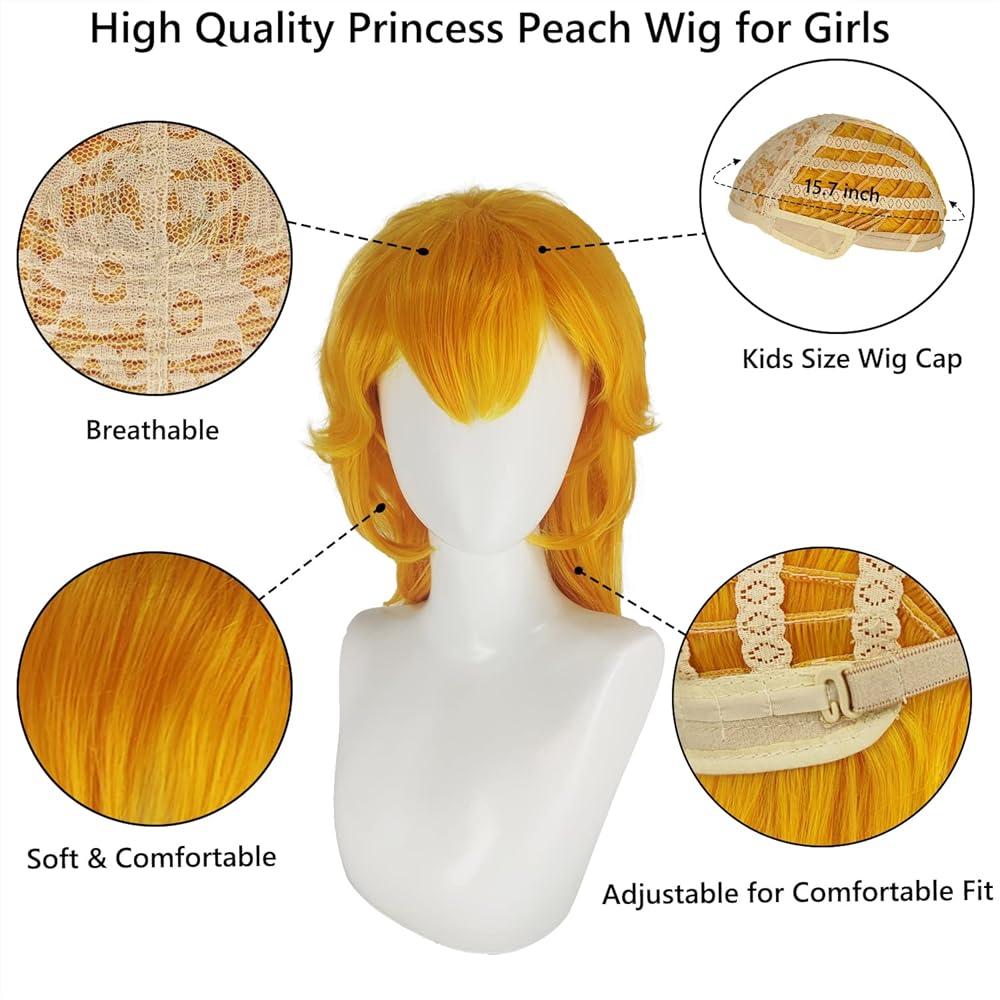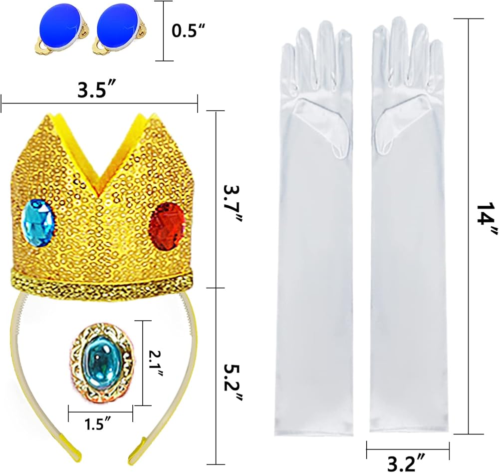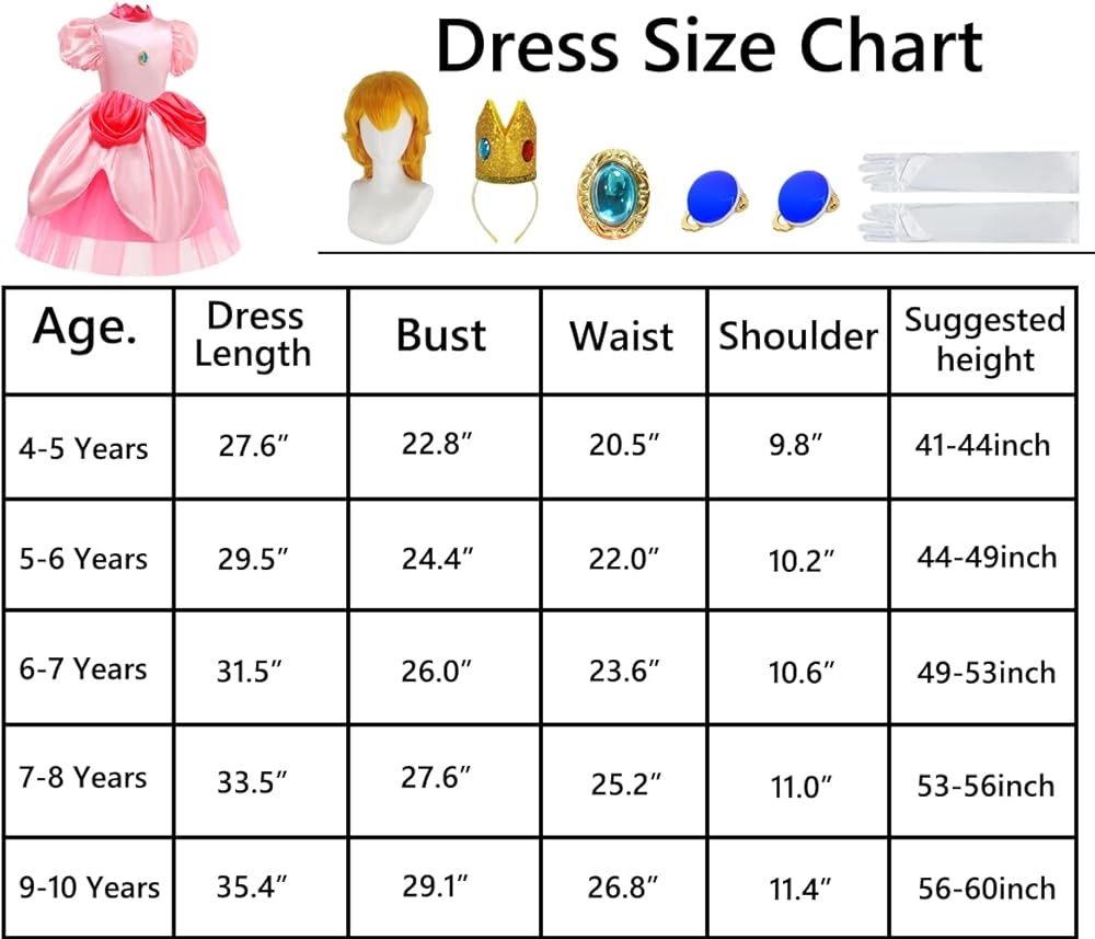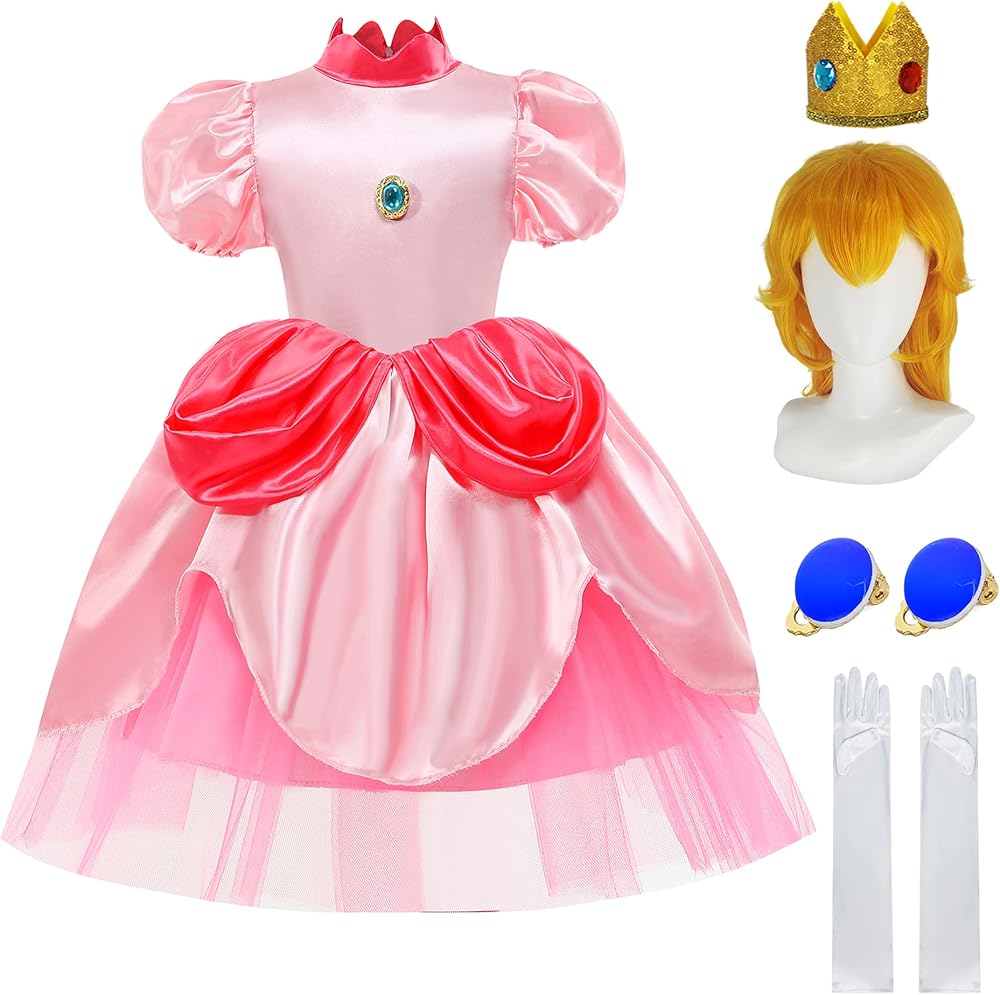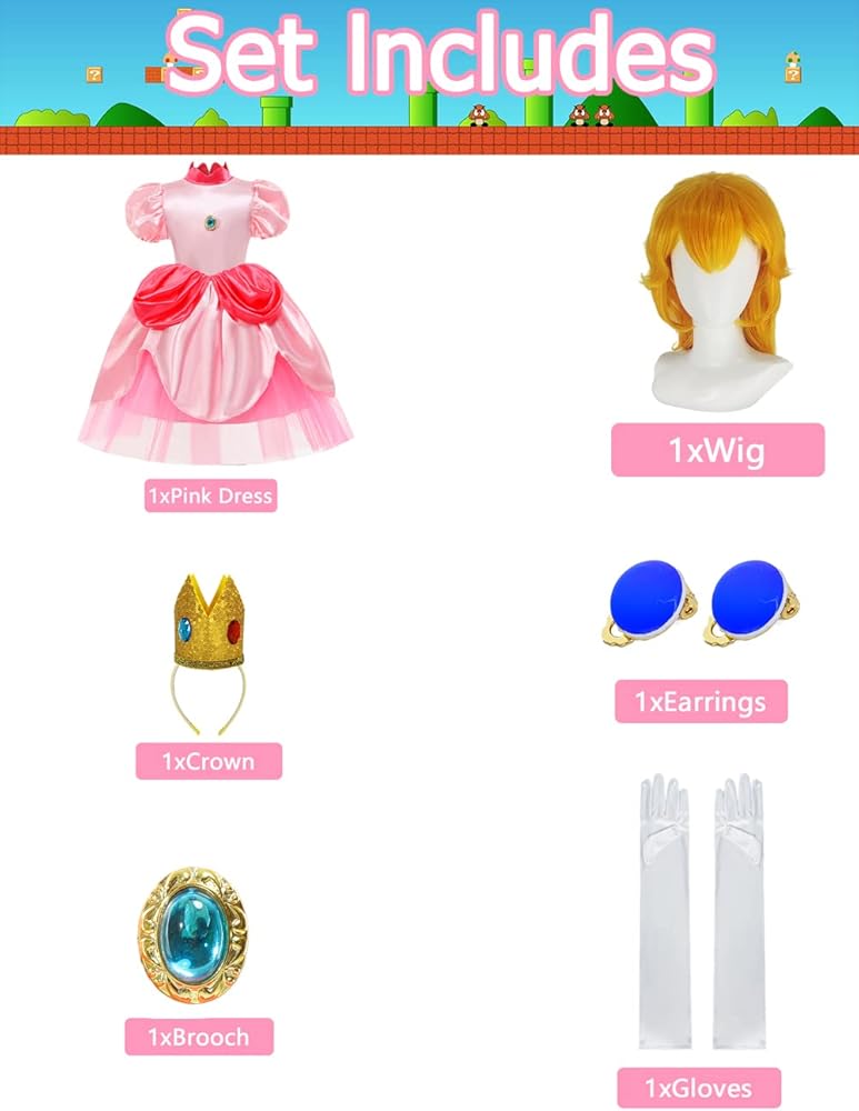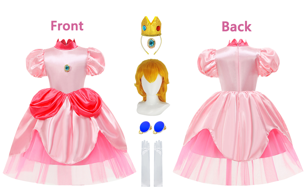 فستان الأميرة الخوخ مع الملحقات: 1 × فستان الأميرة الخوخ، 1 × شعر مستعار الأميرة الخوخ، 1 × تاج الأميرة الخوخ، 1 × قفازات الأميرة الخوخ، 1 × أقراط الأميرة الخوخ. يأتي زي الأميرة الخوخ هذا للفتيات مع جميع الملحقات اللازمة لإكمال المظهر السحري، مما يضمن أن طفلك يشعر وكأنه ملكي.