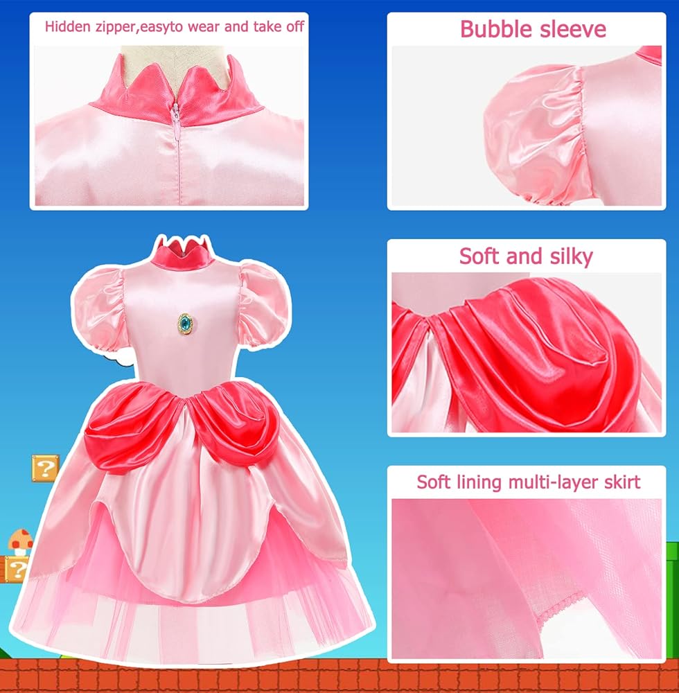 زي الأميرة الخوخي الأيقوني: تم تصميم فستان الأميرة الخوخي الرائع هذا للفتيات لتوفير تمثيل مذهل وأصلي لشخصية الأميرة بيتش الشهيرة، مما يجعل طفلك يشعر وكأنه أميرة حقيقية.