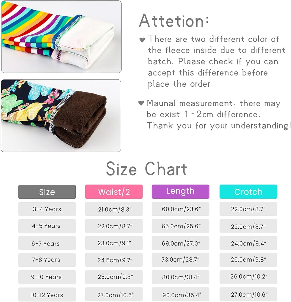 تتضمن العبوة: 1 × طماق للفتيات. متوفر في 6 مقاسات لتناسب الأطفال الصغار والمراهقين من سن 3 إلى 12 عامًا. يرجى اختيار المقاس الأفضل وفقًا لمخطط المقاسات كما في الصورة. اطلب مقاسًا أكبر بدرجة واحدة إذا كان أطفالك يعانون من زيادة الوزن أو غير متأكدين من المقاس