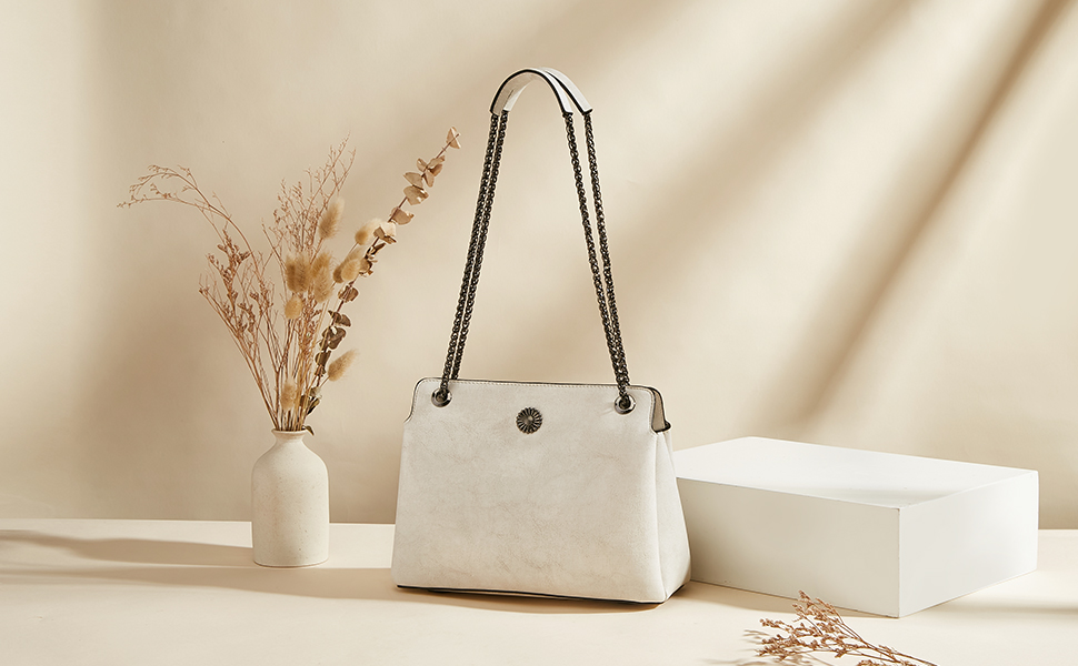 المواد - مصنوعة من جلد البقر المقسوم، مما يعزز النعومة والراحة. بطانة البوليستر حريرية ولن تخدش متعلقاتك الشخصية. مقابض حزام سلسلة متينة تنزلق بسهولة على الكتف أو الذراع. مغلفة في عبوة حماية كاملة لضمان حصولك على حقيبة يد جديدة تمامًا.