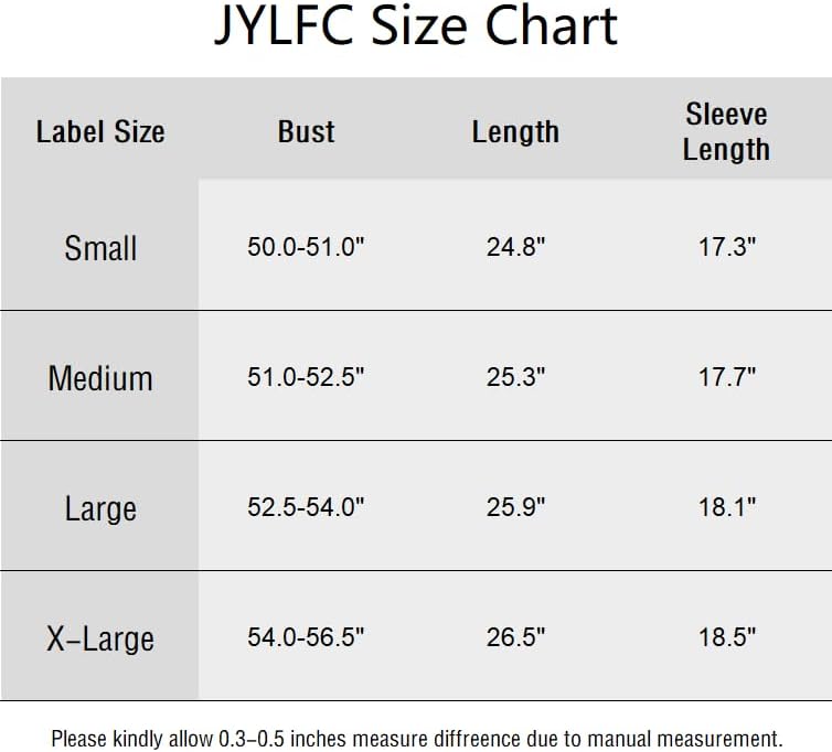 متوسط: الصدر 51.0-52.5 بوصة، الطول 25.3 بوصة، طول الكم 17.7 بوصة