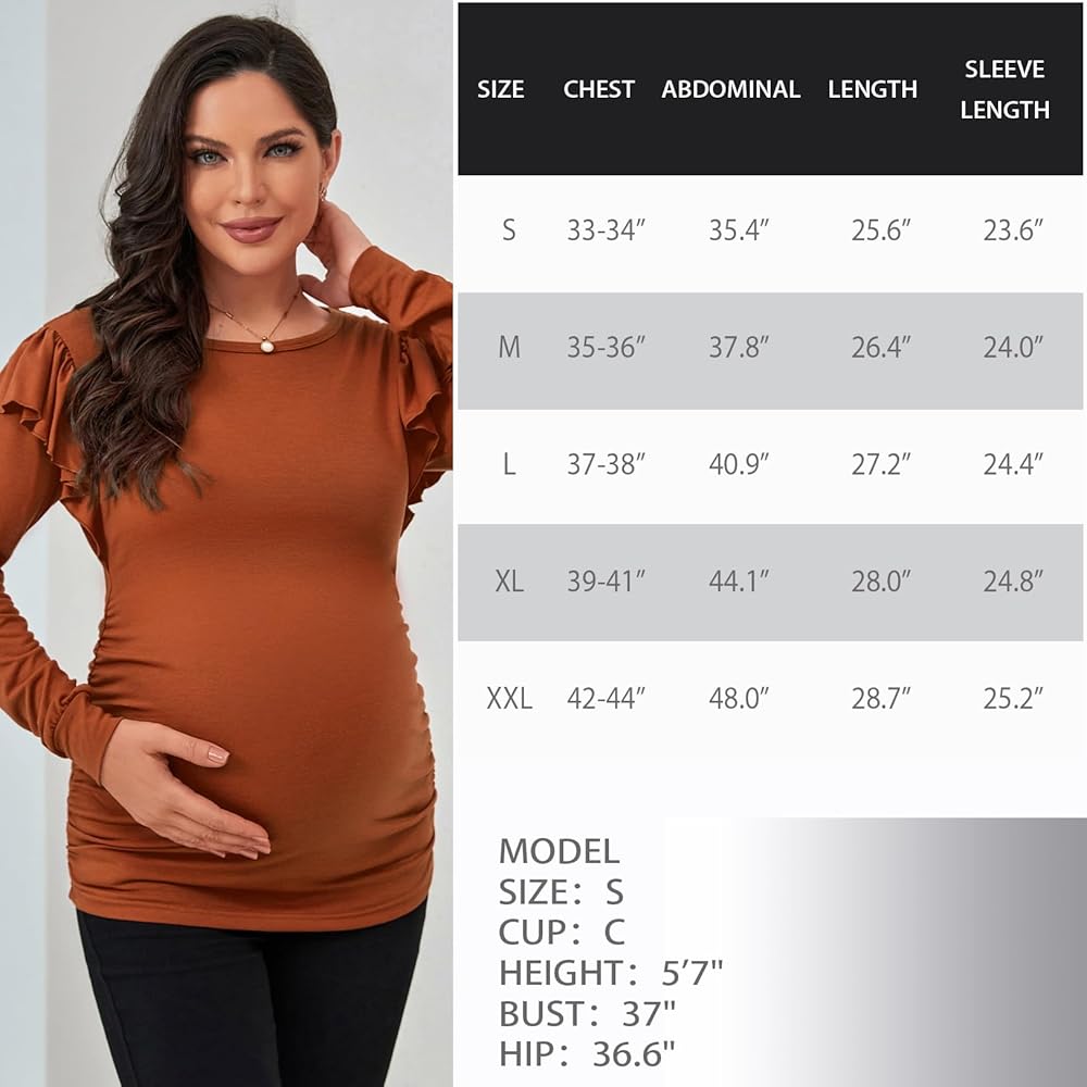 المزايا: زخرفة مكشكشة تزين الكتفين، مما يزيد من جاذبية هذا القميص، كما يوفر الجانب المرن المكشكش مساحة كافية لبطنك المتنامي.