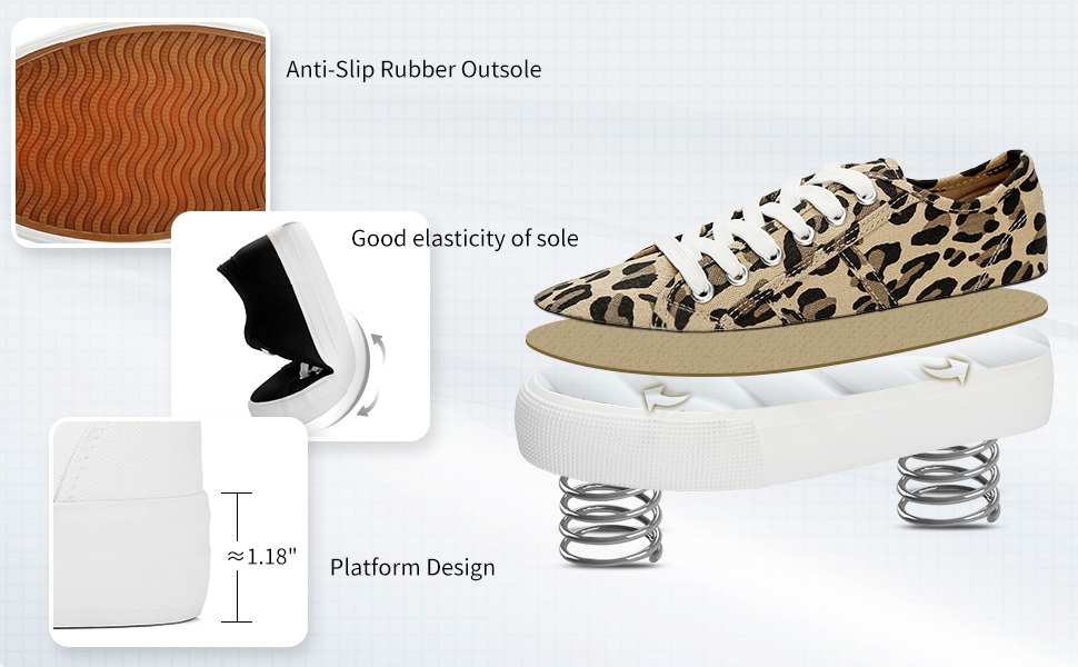 تصميم المنصة: يبلغ سمك النعل الخارجي للأحذية الرياضية النسائية باللون الأبيض/الأسود/الوردي/الفهد حوالي 1.18 بوصة، مما يوفر التوازن والثبات، ويرفع طول الساق بصريًا.