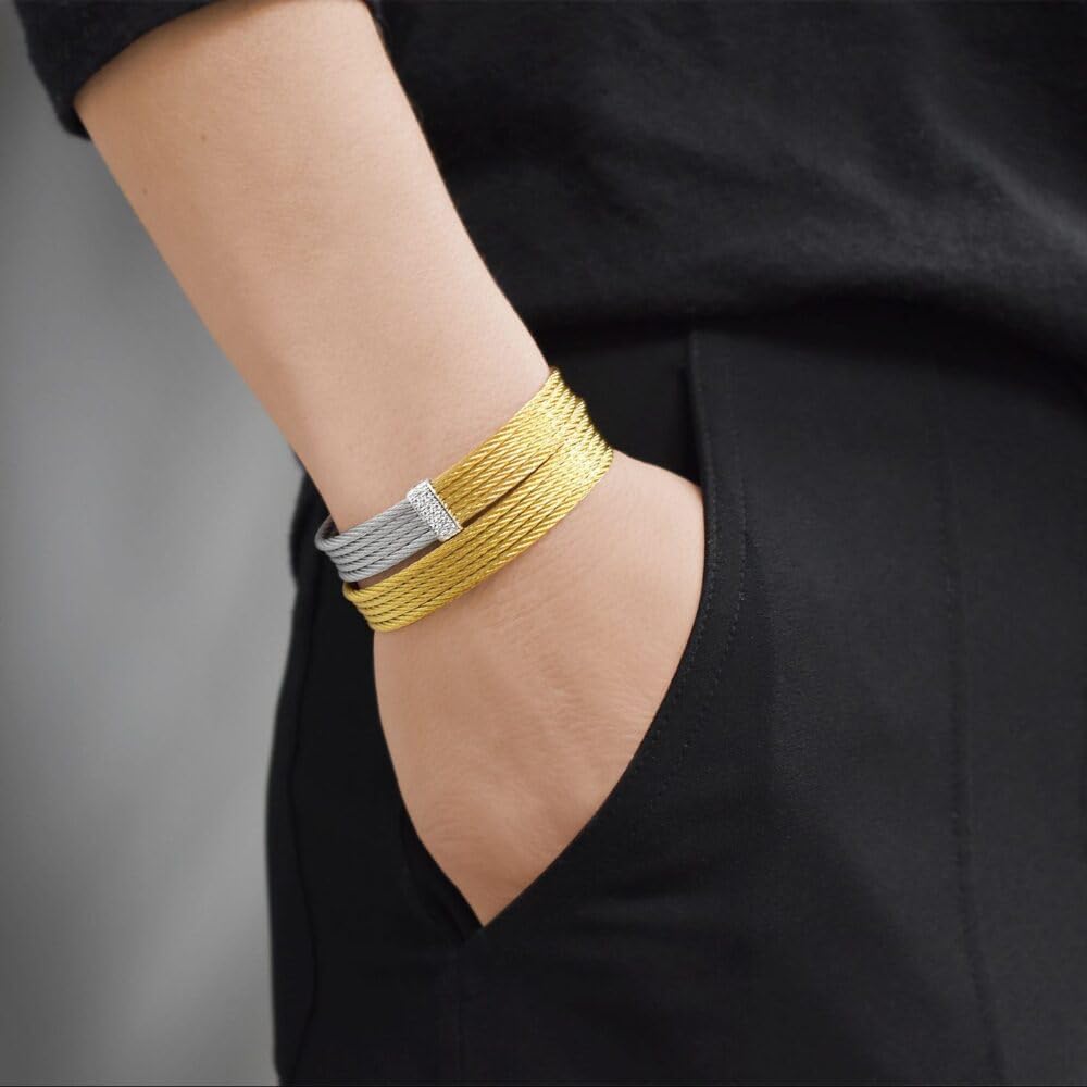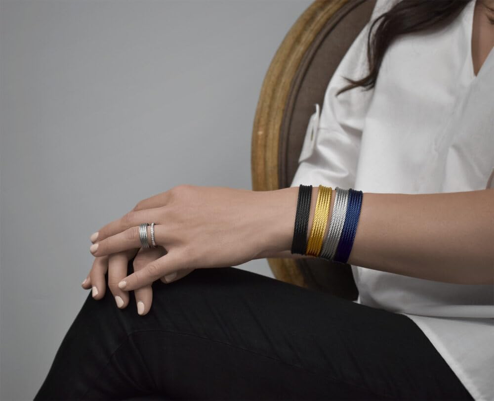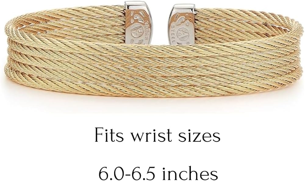 خامة عالية الجودة: أساور مكونة من 5 صفوف من مجموعة Cuff Essentials. يجمع سوار الكفة الخاص بنا بين عناصر التصميم الحديثة والكلاسيكية والمواد عالية الجودة والحرفية. مصنوع من كابل متين من الفولاذ المقاوم للصدأ ملتوي إلى حد الكمال، مما يضيف ملمسًا وأبعادًا للحصول على مظهر عصري وعصري.